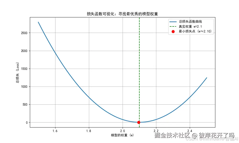 - 当模型的权重 w 等于2.1时,总损失最小(红点处)。