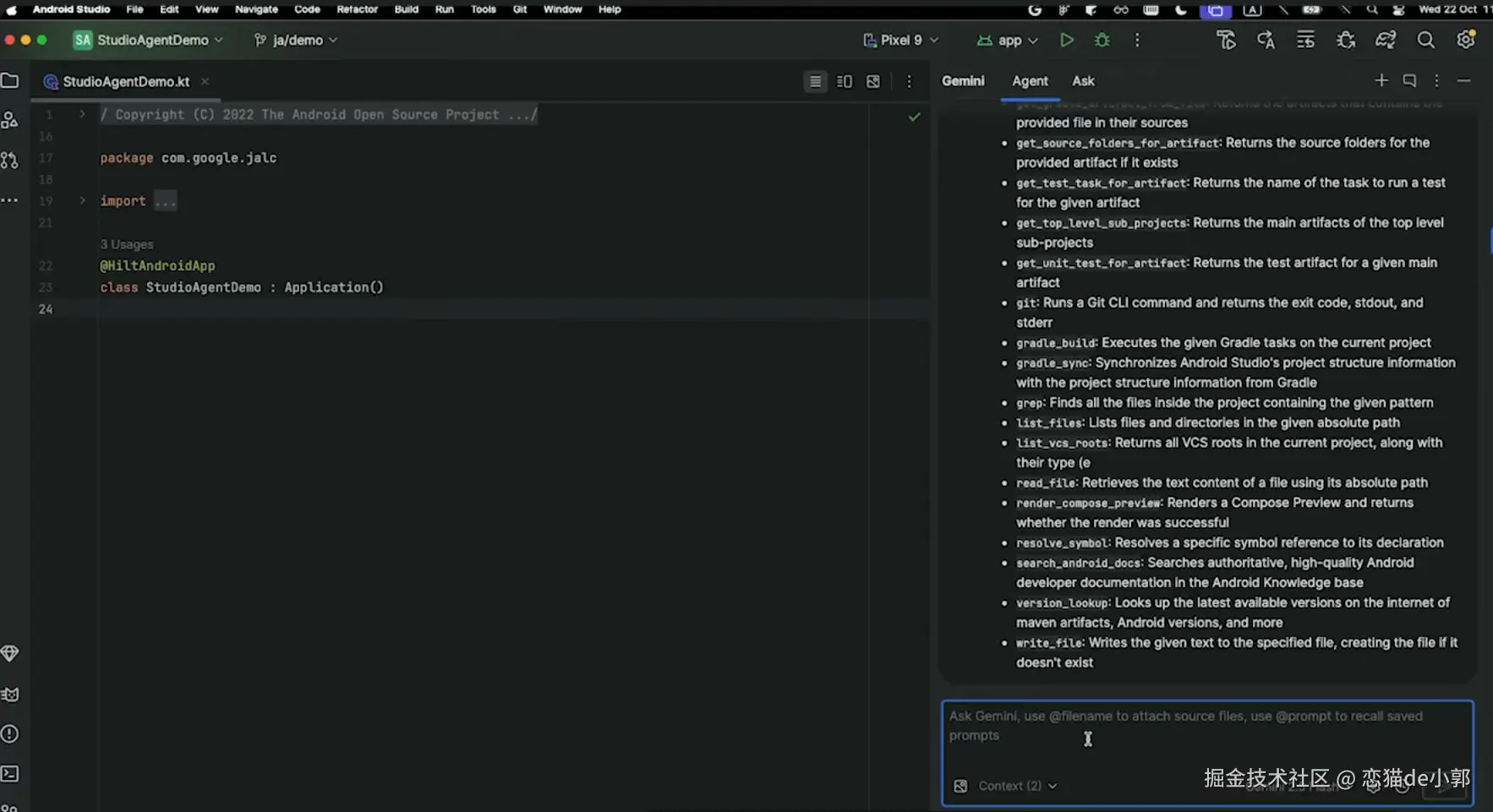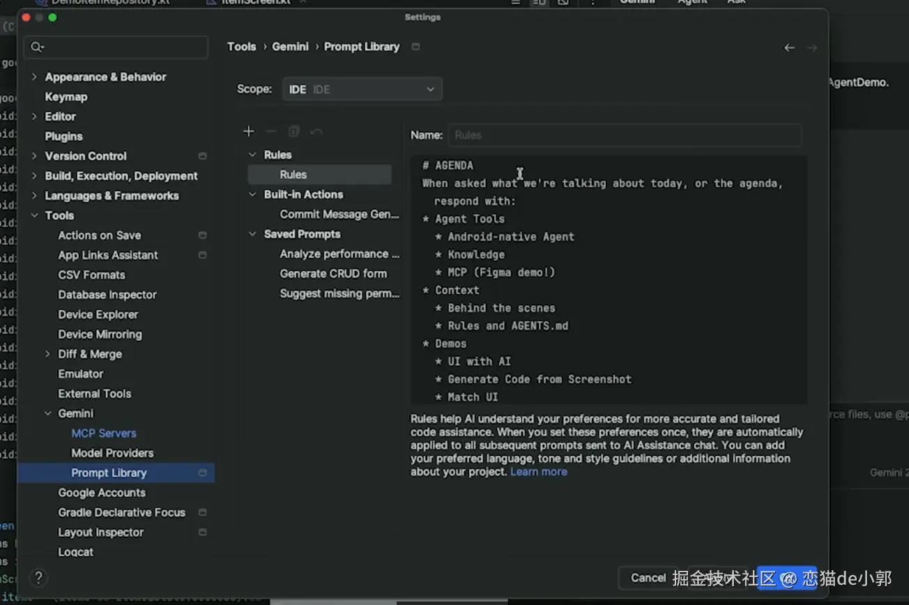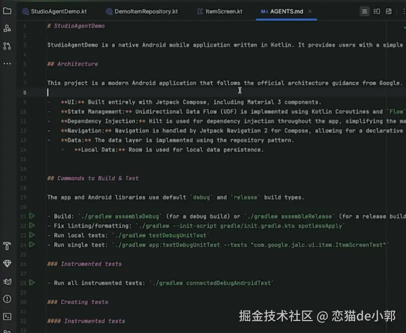 - agents.md :团队共享的标准文件,可以在其中定义项目架构(如 Hilt)、代码风格或业务描述,Agent 会在执行任务时读取文件保持一致性
