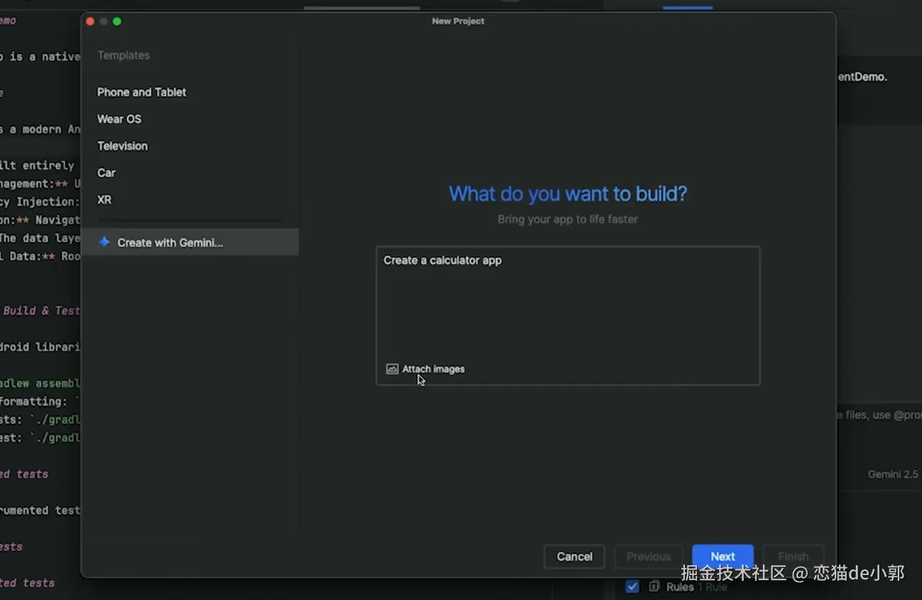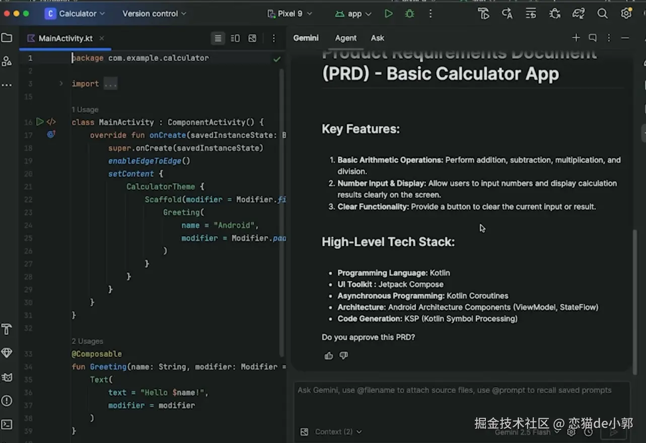 通过自然语言 Prompt 生成完整的应用原型,Agent 会先生成一个计划(包含库和工具),用户确认后,它会生成 ViewModels、Compose UI 代码甚至单元测试