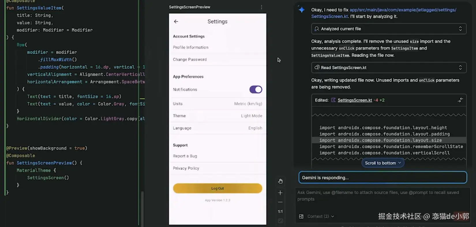 之后用户可以将 UI 截图拖入会话,Agent 会分析并生成对应的 Jetpack Compose 代码 ,这个过程它会尝试重用现有组件,如果缺少资源(如特定图标),它甚至会尝试生成新的 Vector Drawable