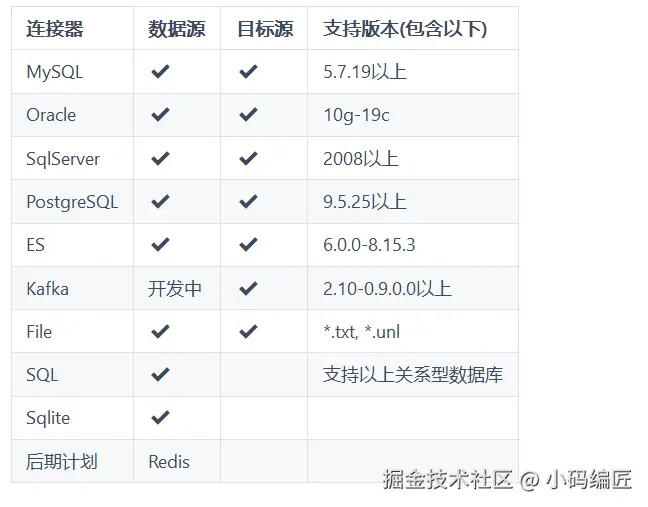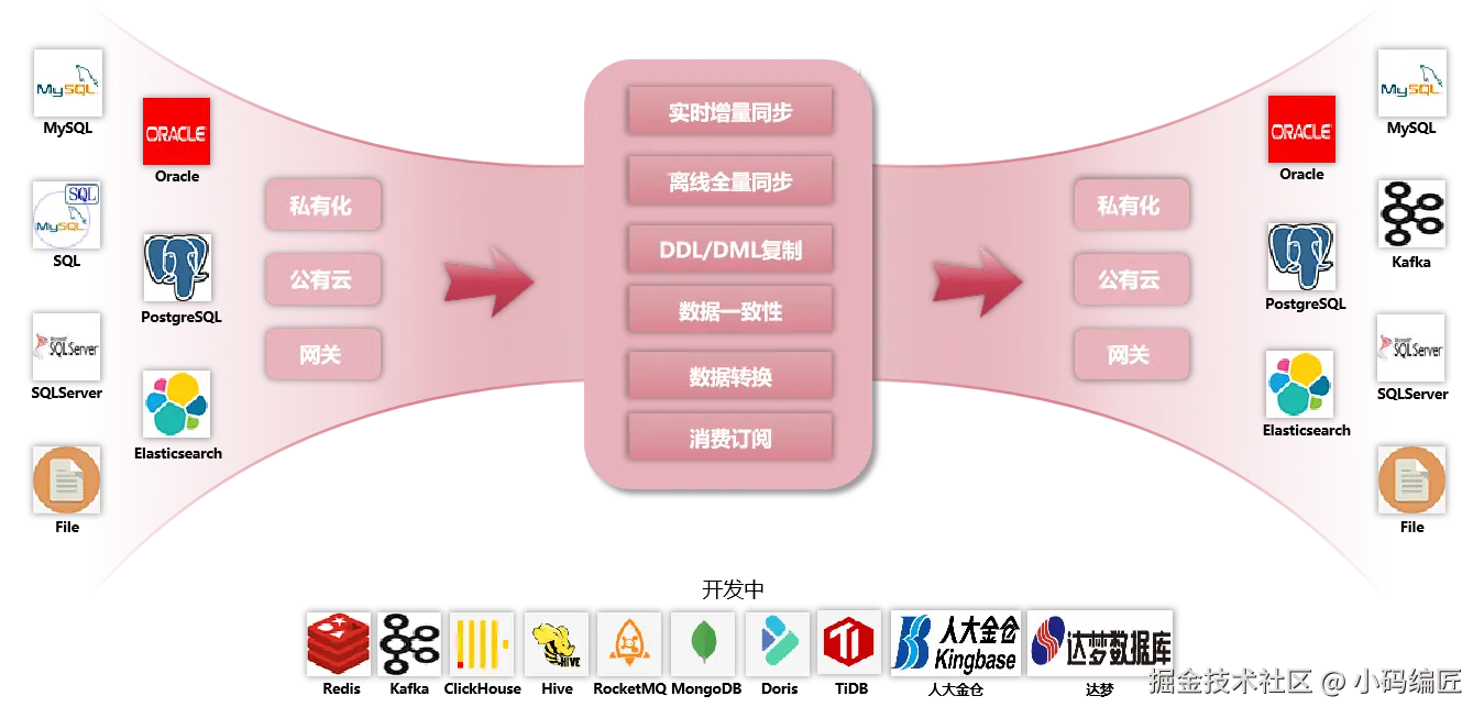 支持关系型与非关系型数据库之间的任意组合同步,如 MySQL 到 ES、PostgreSQL 到 Kafka 等。