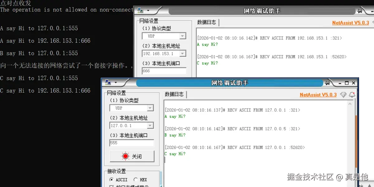 Console.WriteLine("A say Hi to 192.168.153.1:666");