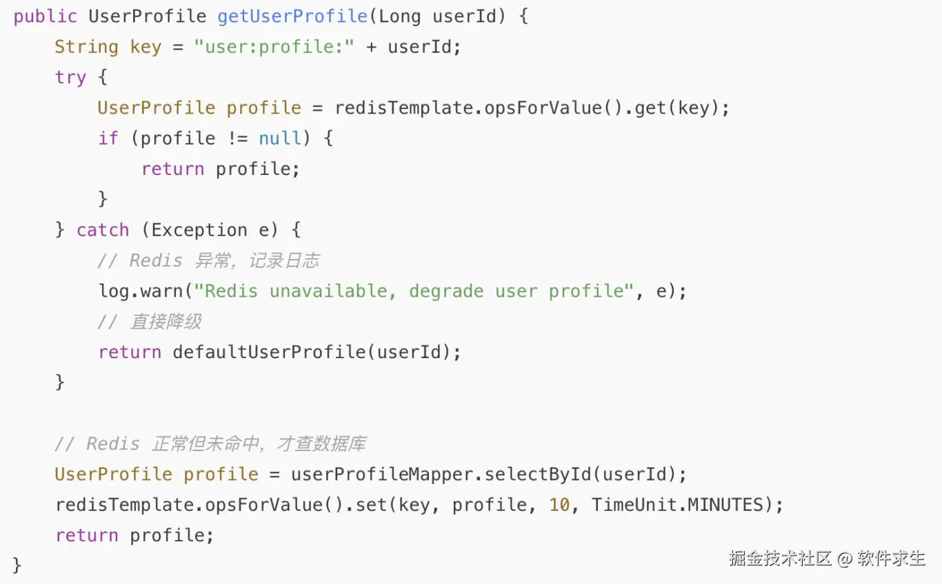 这就是缓存降级的精髓: Redis 不行,我宁愿“给差一点的结果”,也不把数据库拖下水。