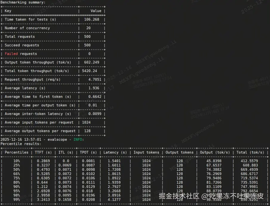 - output_tokens_per_sec (输出token吞吐量) = sum(x.info.output_tokens for x in all_successful) / total_time