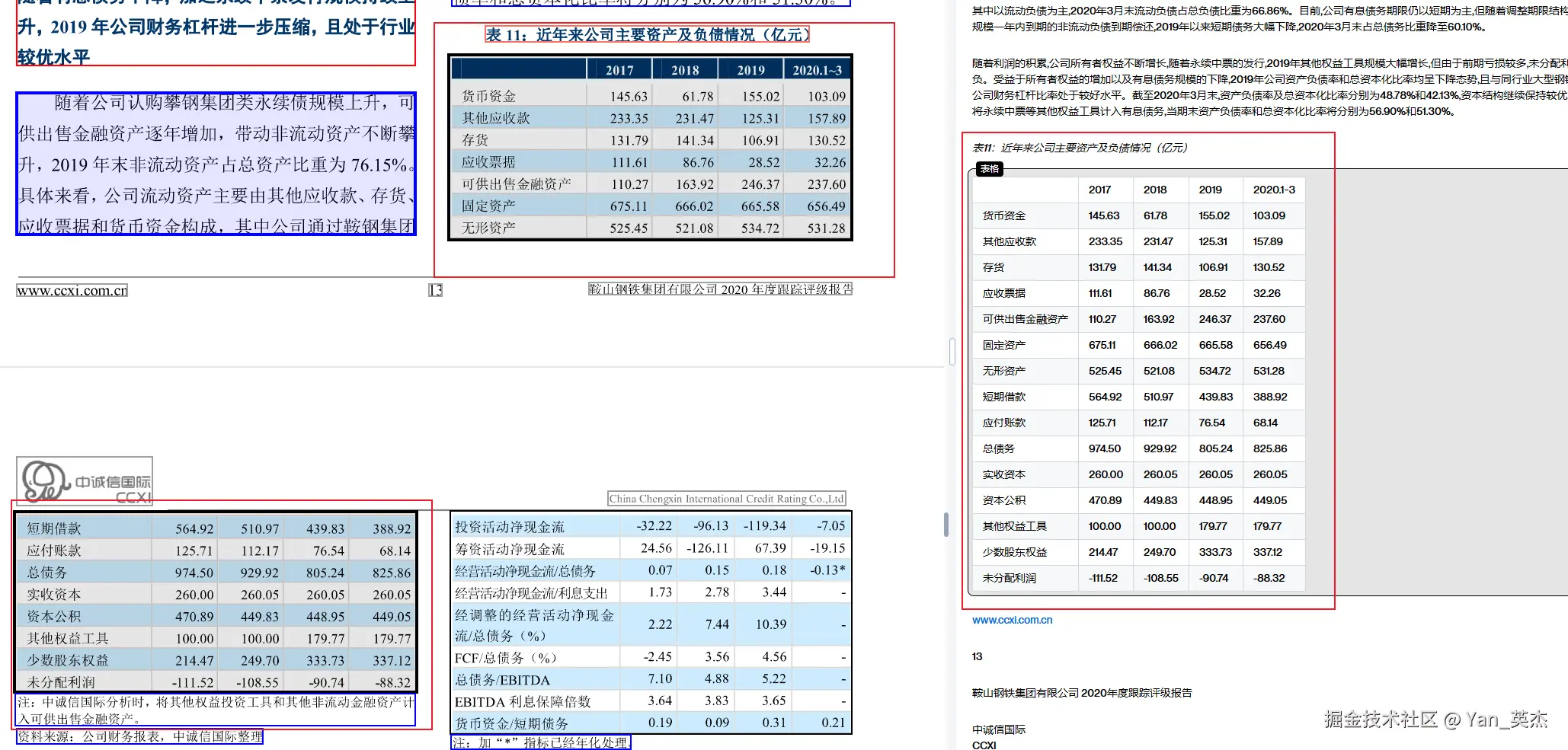 - 左侧原始图:这是一个复杂的跨页表格,内容包括近年来公司主要资产及负债情况。这种表格常见于企业报表中,通常需要人工拼接和确认数据的完整性。