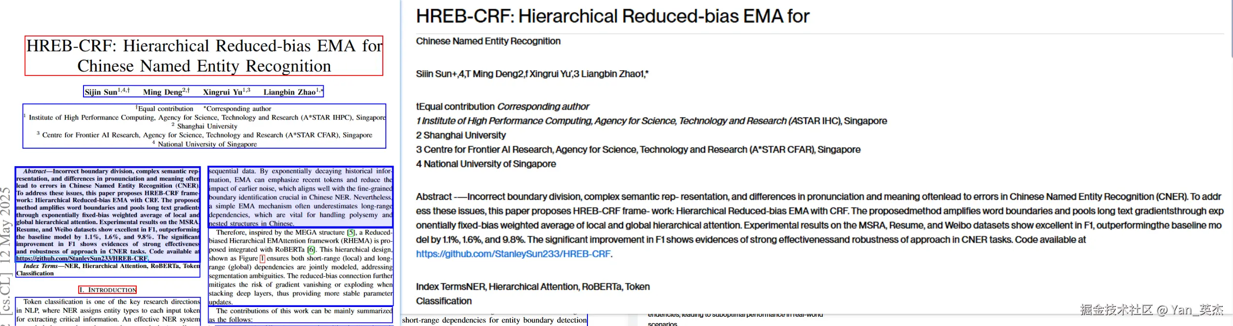 如图左侧所示,原始 PDF 中包含标题、作者、机构、摘要、关键词和正文多个区域。