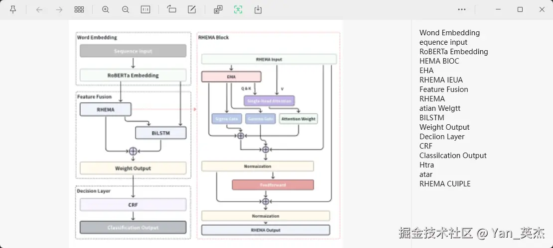 若换成表格或图片结构图,问题会更突出。 如图所示,左侧是模型结构示意图,右侧是传统 OCR 的识别结果,可以看到: