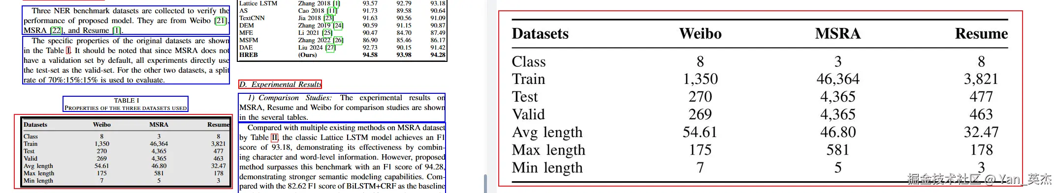 原文中的表格被解析为带行列头的结构化表数据,而不是一串Datasets Weibo MSRA Resume Class 8 3 8 …的扁平文本,可直接用于数据统计、可视化与自动分析。