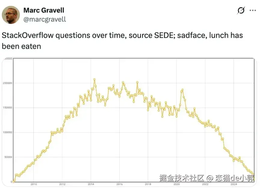 就连 Android Studio 的全新 AI Agent ,都在不断增加 vibe coding 的支持,AI 在开发者领域如今确实已经成为不可或缺的存在,就像 StackOverflow ,随着 AI 的发展,如今的“活人”流量可以说是几乎跌停,这大概也是 AI 浪潮的典型体现: