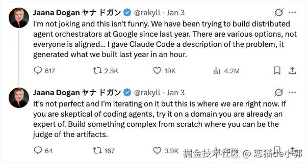 就连谷歌 Gemini API 负责人都自曝,用竞品 Claude Code 在 1小时复现自己团队一年成果,虽然还不够完美,但是这已经很能说明问题:不要和 AI 比代码输出的能力 。