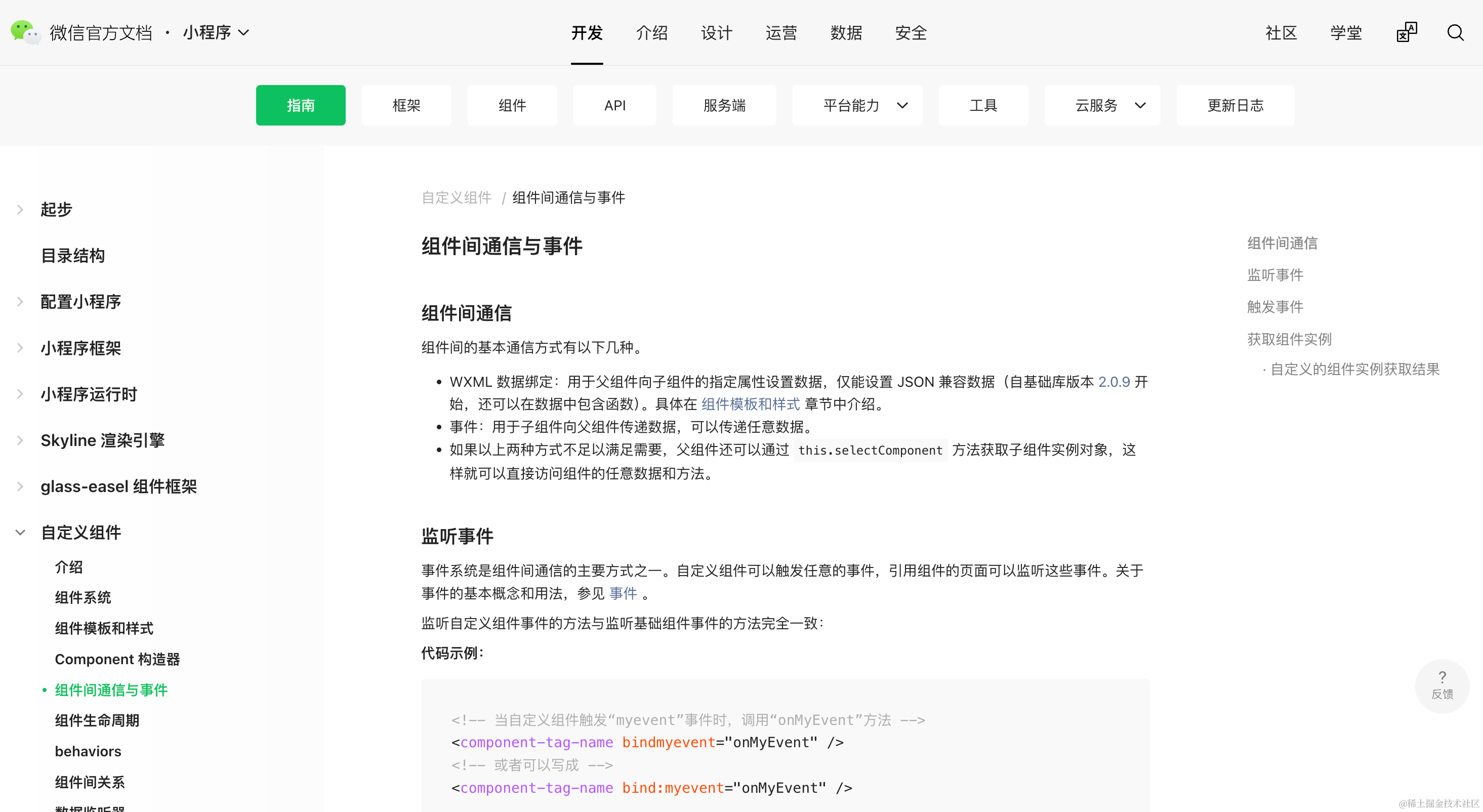 - WXML 数据绑定:用于父组件向子组件的指定属性设置数据,仅能设置 JSON 兼容数据(自基础库版本 2.0.9 开始,还可以在数据中包含函数)。具体在 组件模板和样式 章节中介绍。