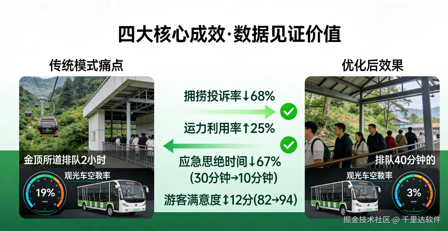 应急响应效率提升:突发情况(天气、设备故障)的运力调整响应时间从30分钟缩短至10分钟,游客滞留事件发生率降为0;