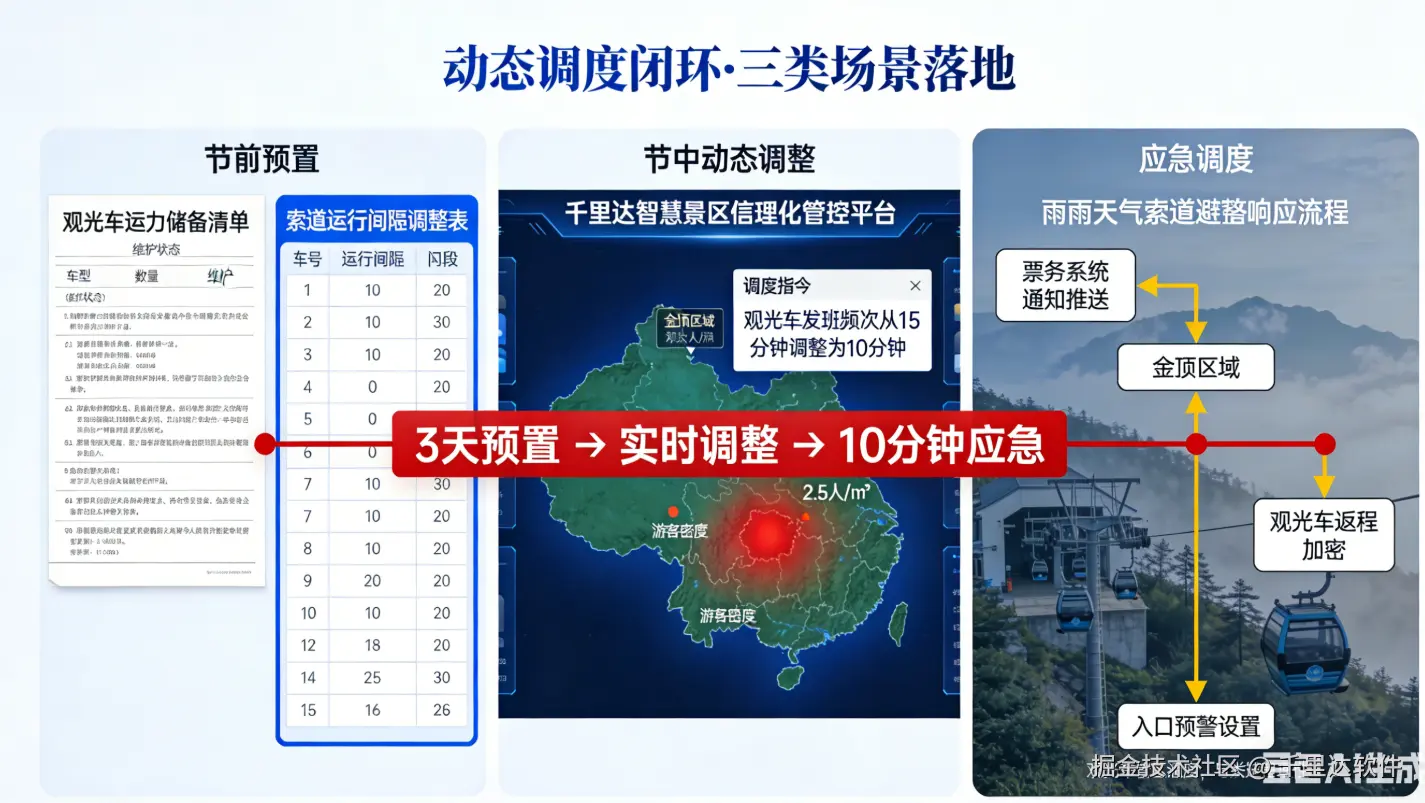 基于精准预测,峨眉山通过千里达智慧景区一体化管控平台,联动千里达景区票务系统、索道管理系统、观光车调度系统,实现“运力与客流的实时匹配”,核心分为“节前预置、节中动态调整、突发应急调度”三类场景: