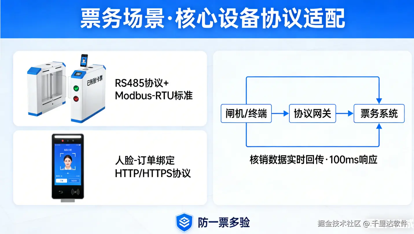 (一)票务场景:4类核心设备,对接千里达景区票务系统