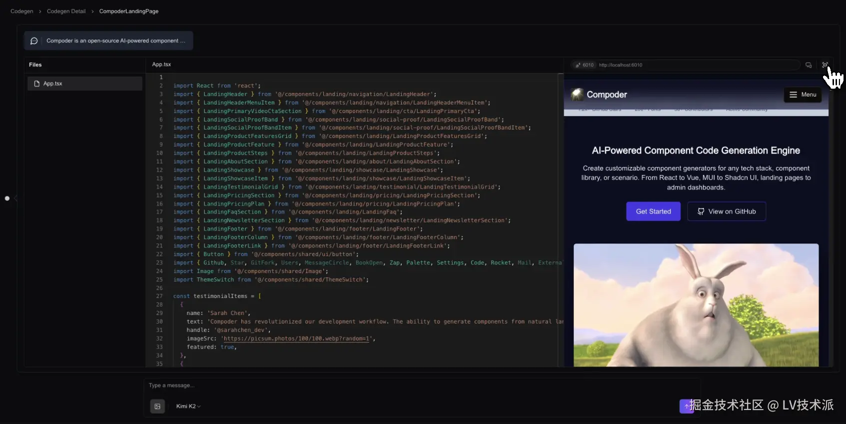 Compoder 是一个 AI 驱动的组件代码生成引擎,可以基于它定制基于特定技术栈(React、Vue、开源组件库、私有组件库)、特定业务场景(landing page 等)的组件代码生成器。