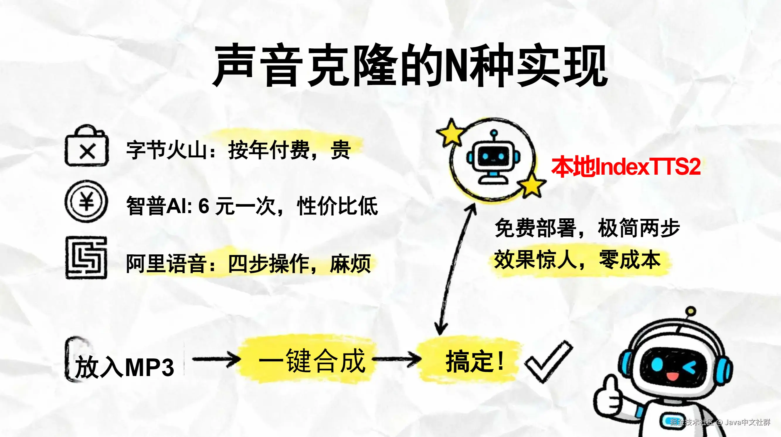- 本地部署(GPT-SoVITS / indexTTS2): 走的是“极客路线”,完全开源免费,且一步到位。