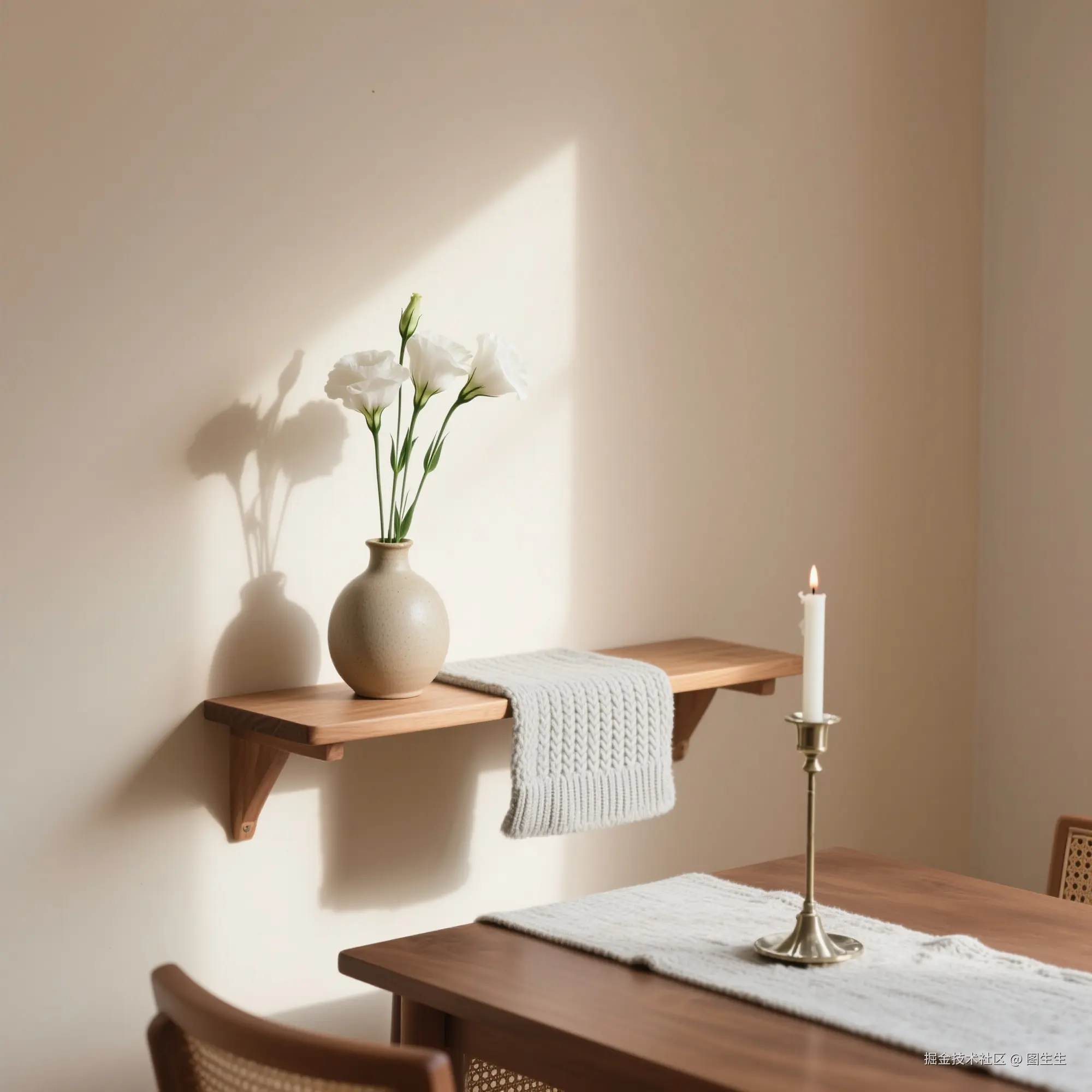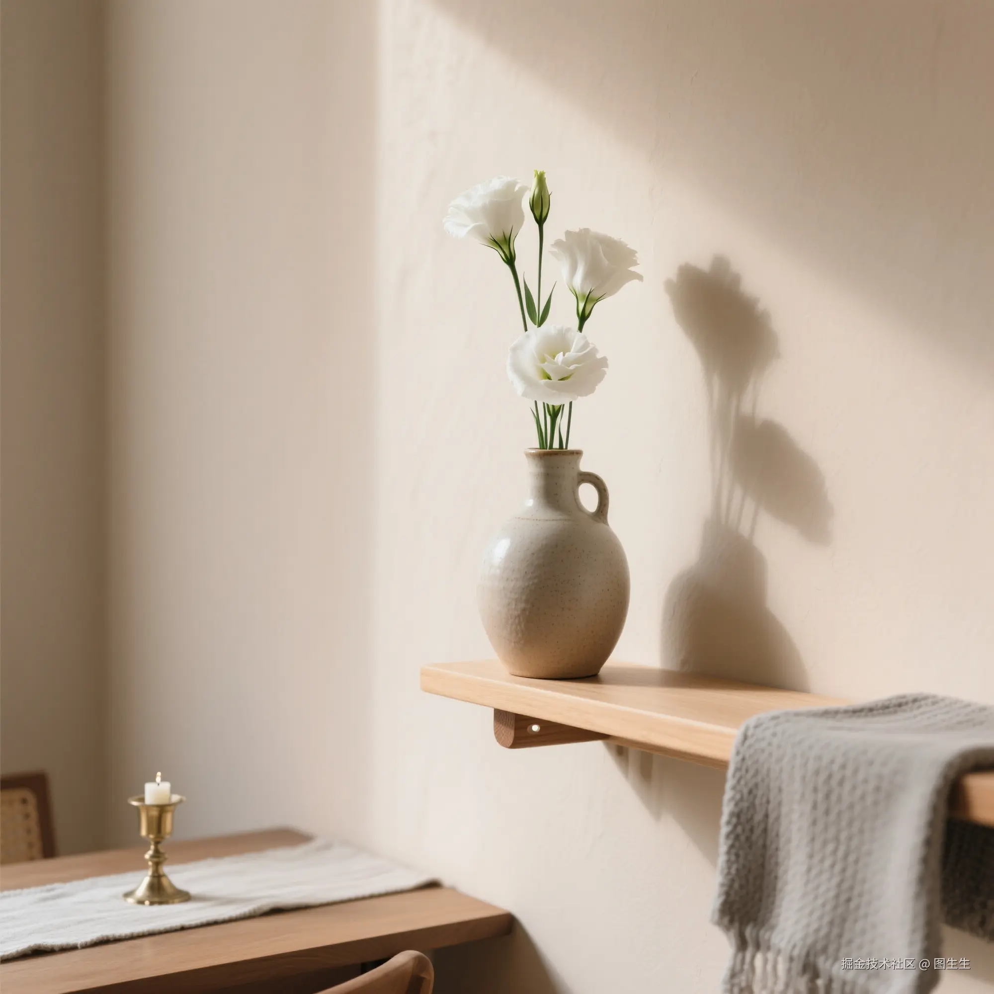 ins风简约客厅角落的陶瓷花瓶,摆放于原木色悬浮置物架上,瓶中插3支白色洋桔梗,旁边点缀浅灰色针织桌旗与金属小烛台,背景是浅奶茶色墙面,午后45度柔光照射,形成柔和阴影,高清写实质感
