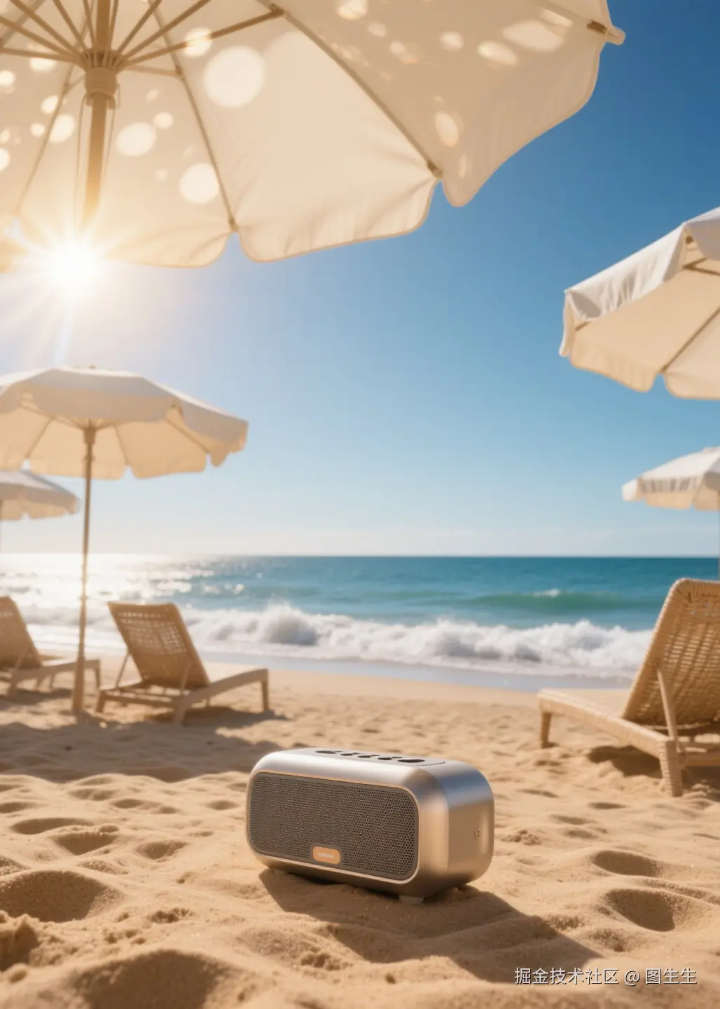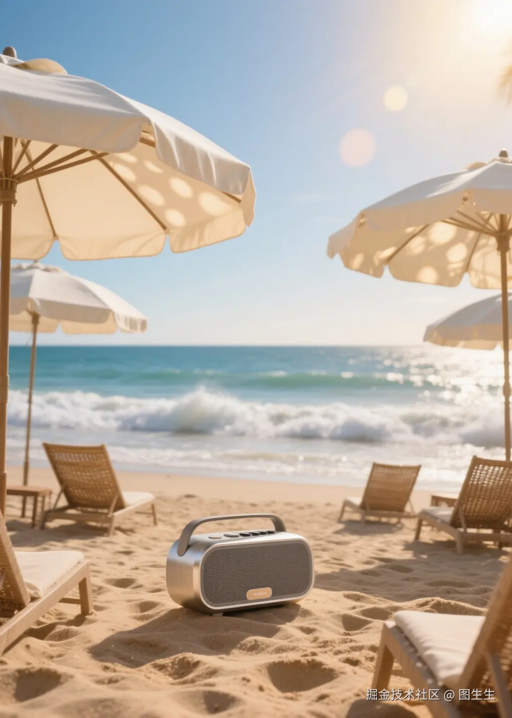 一个在阳光明媚的沙滩上使用的蓝牙音箱,周围有遮阳伞、沙滩椅,远处是蓝色的大海和白色的浪花,暖色调光线,高清摄影质感