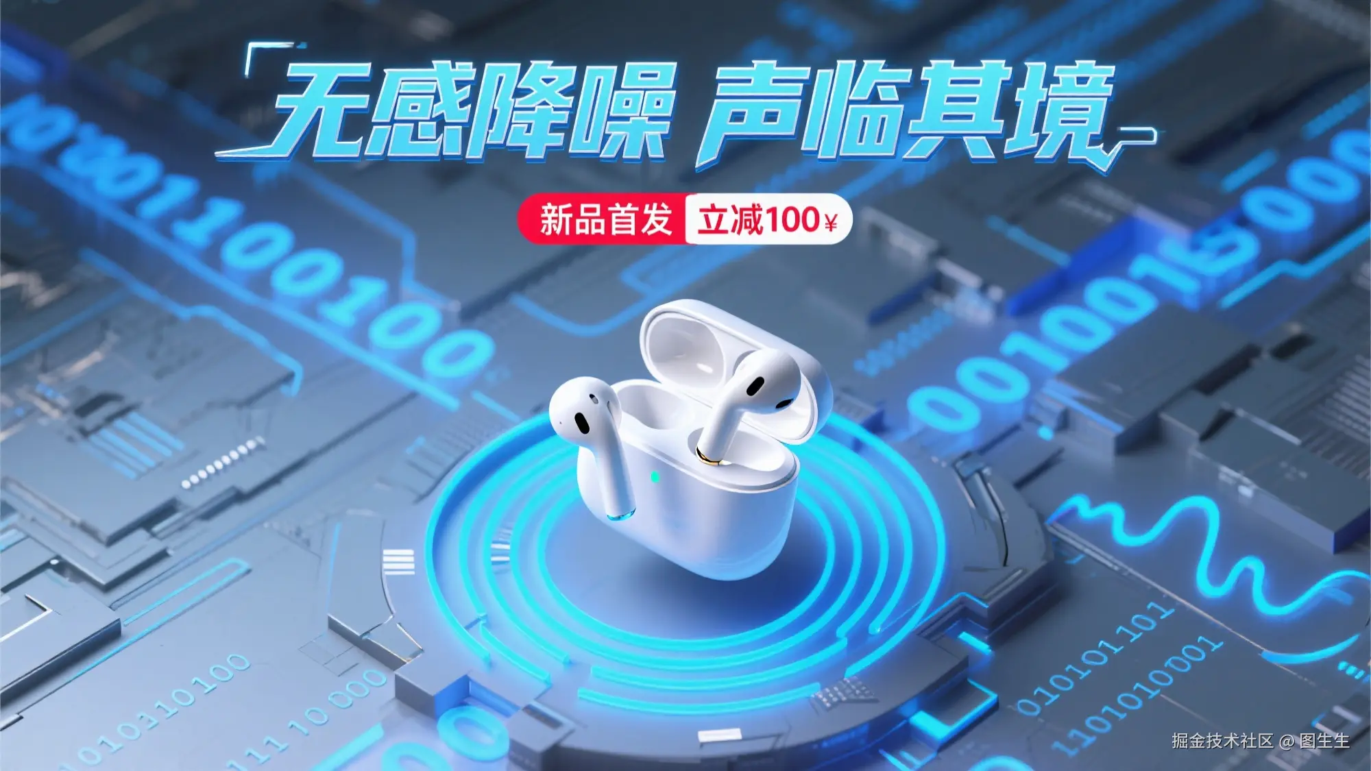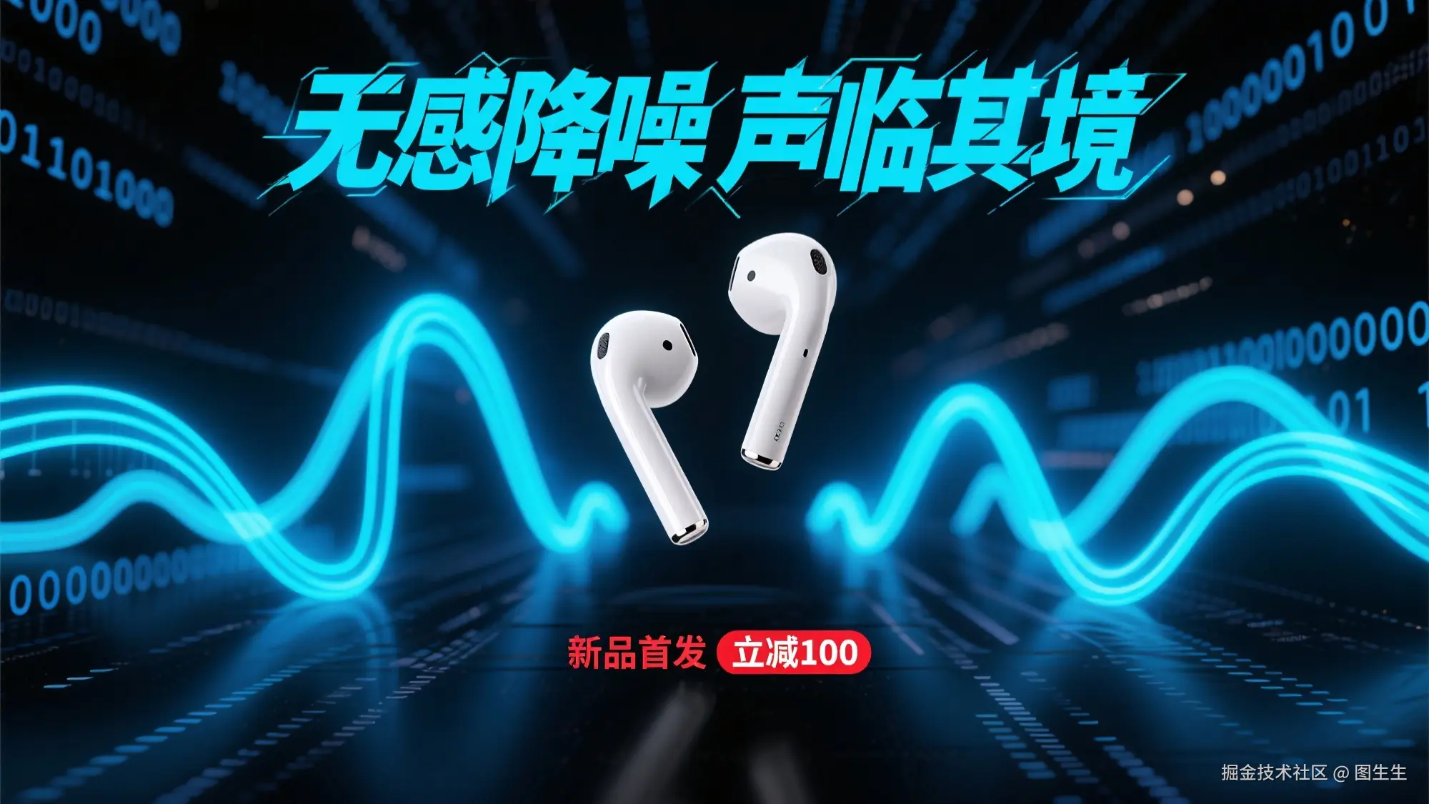 需求: 16:9比例,新款无线蓝牙耳机首发推广海报,需突出科技感。