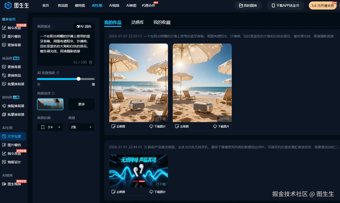 选择生图数量(1-4张),点击“开始生图”按钮,等待10秒左右即可获取素材,满意直接保存使用,需微调可修改提示词二次生成。