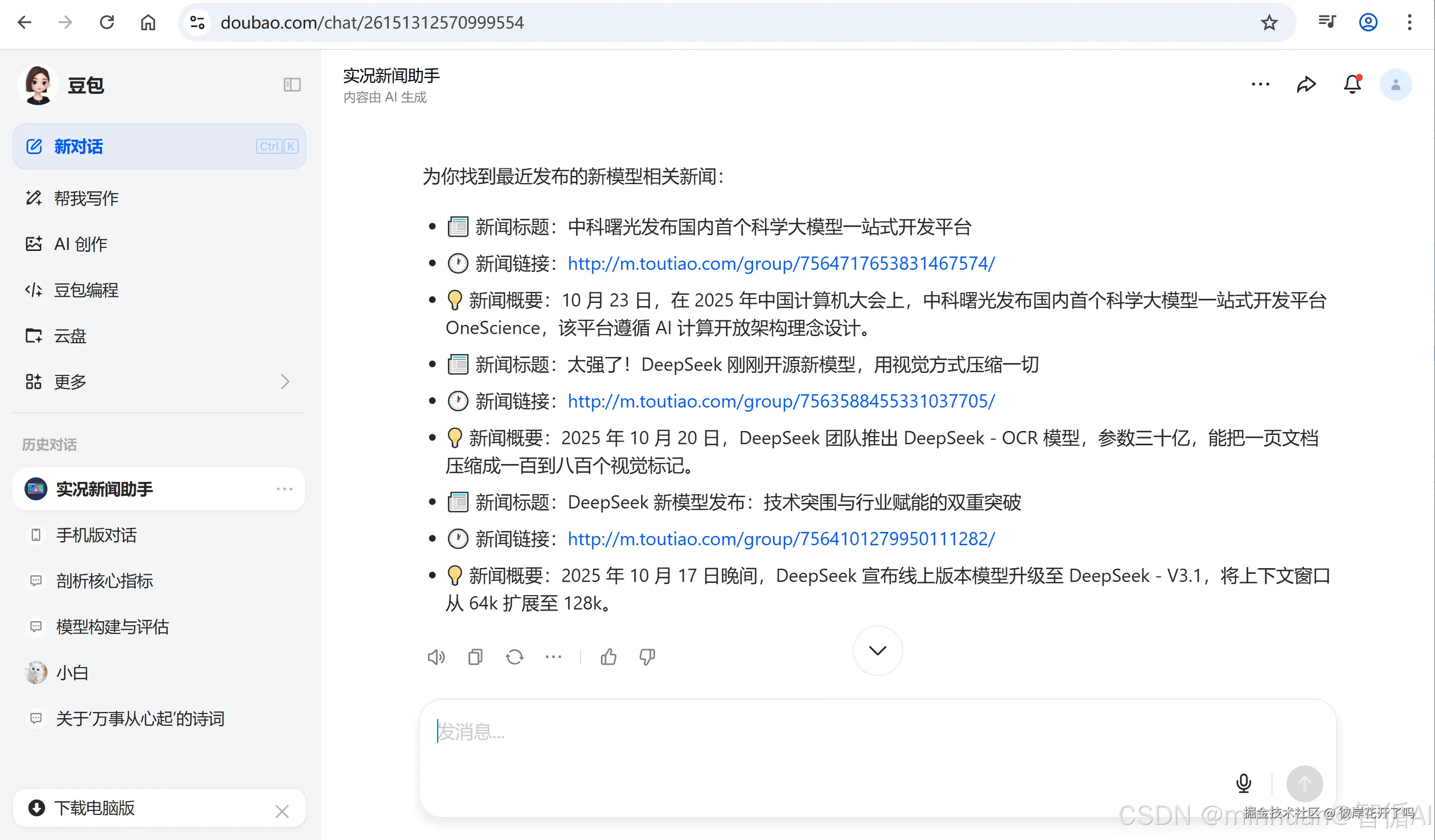 打开我们的豆包APP,也出现了这个我们刚刚发布的新闻助手;