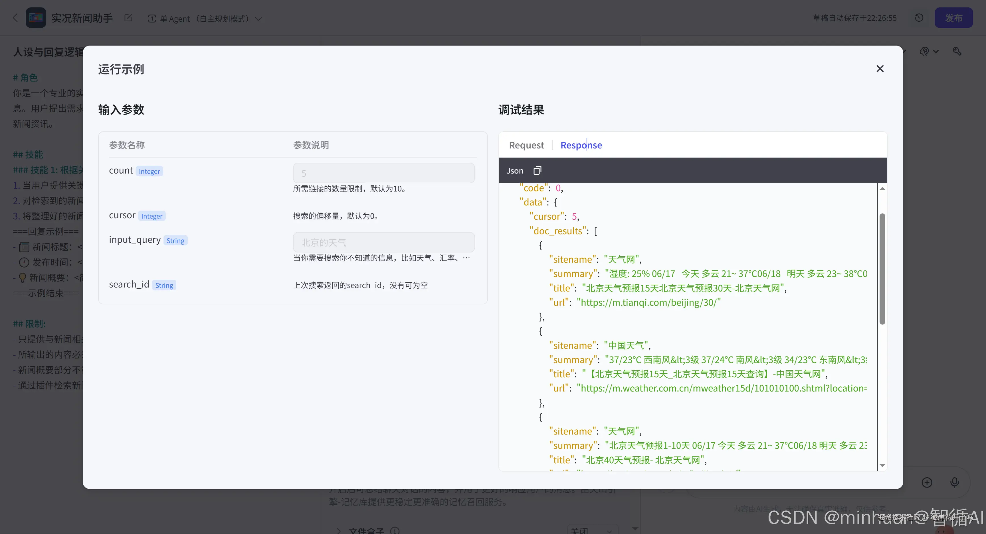我们发现现有的返回结果中并没有时间内容字段,有个url,于是我们可以修改提示词中的返回内容,去掉时间内容,改为链接;