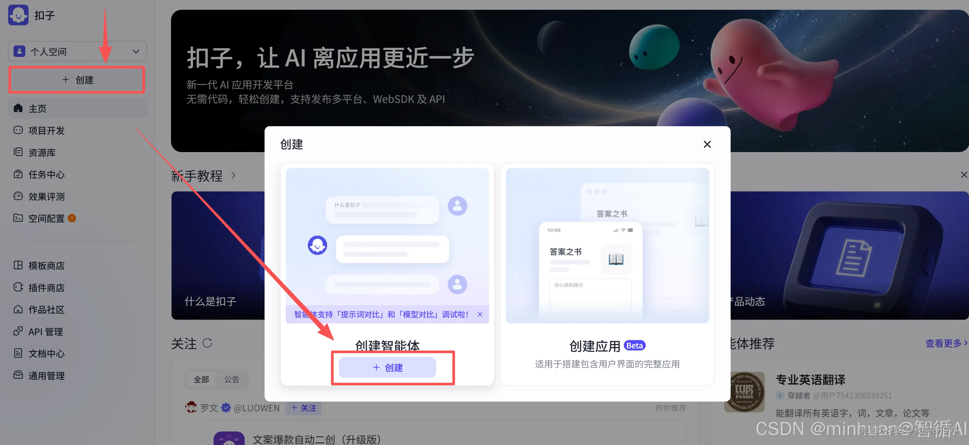 2. 点击【+ 创建】按钮,在弹出的浮窗中点击“创建智能体”下方的【+ 创建】按钮。