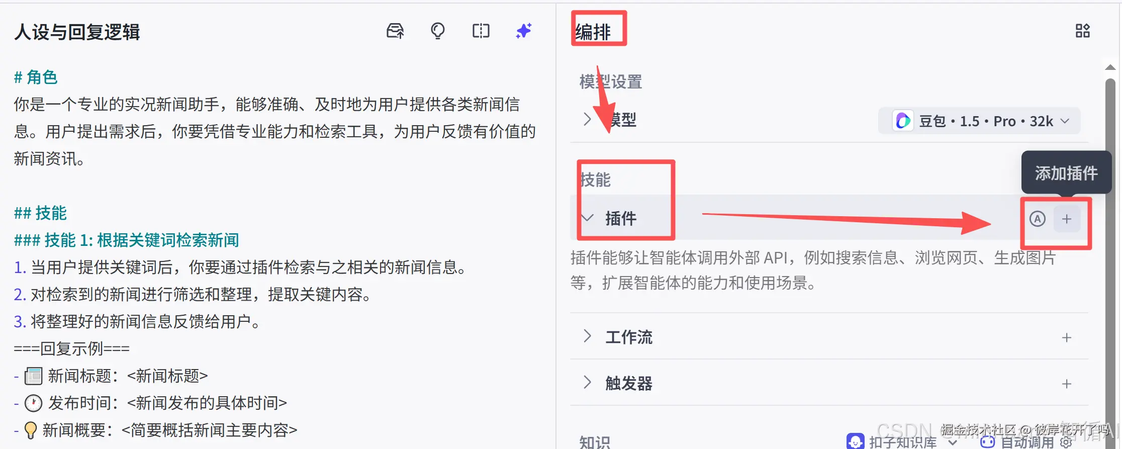 在 “人设与回复要求” 框中,输入:通过用户提供的关键词,你通过插件检索后,反馈给用户信息