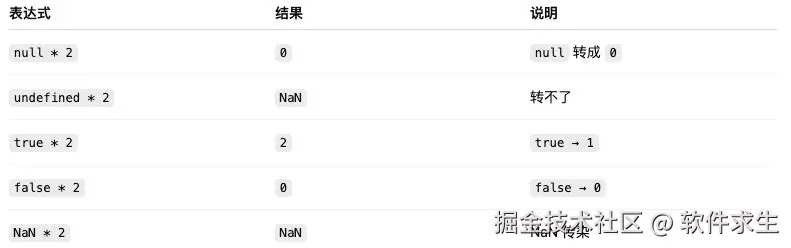 规则很明确:乘法操作符会把操作数隐式转换成 Number 类型