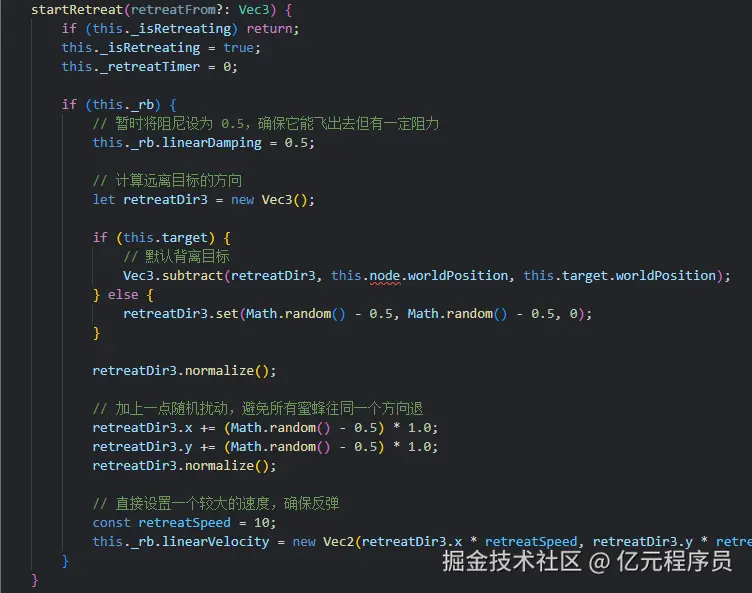 蜜蜂的后撤:计算后撤方向,通过linearVelocity线性速度进行后撤。