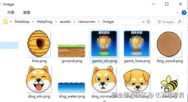 简单准备一批游戏所需的资源,包括蜂巢、地板、胜利/失败界面、木头、狗狗、水和蜜蜂。