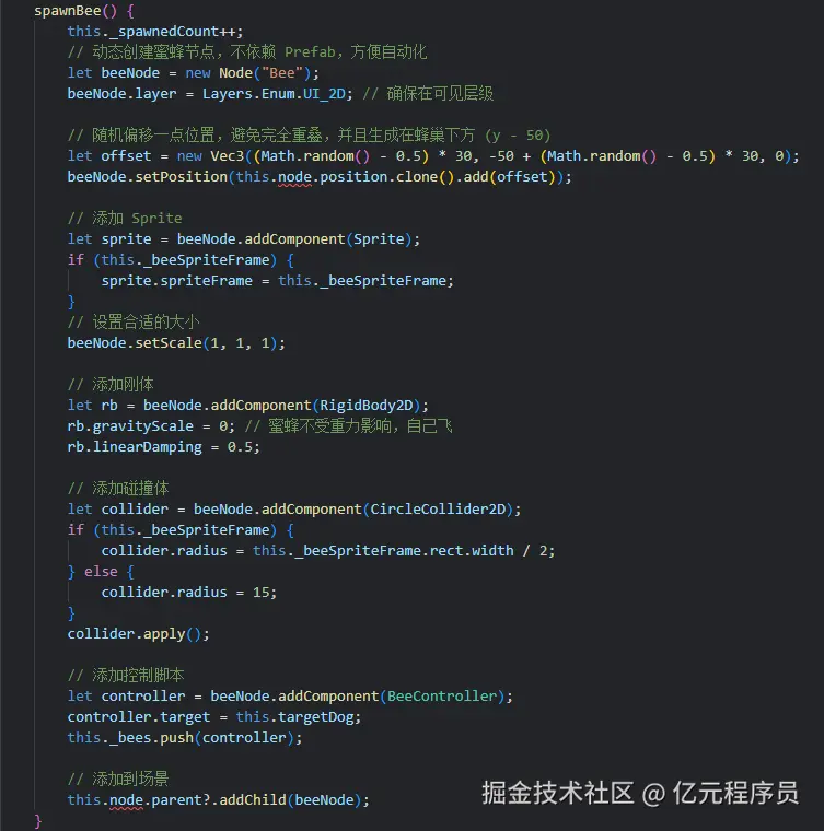 蜂巢的逻辑就相对简单了,就是通过计时,定时创建指定数量的蜜蜂,给蜜蜂添加碰撞相关组件,以及控制脚本即可。