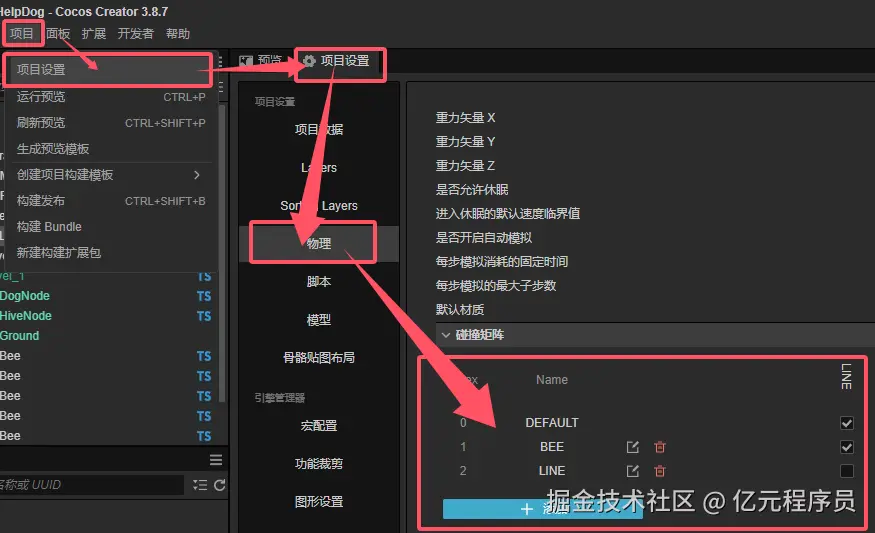 为了区分和判断狗狗和不同的物体发生碰撞,我们需要在菜单项目->项目设置->物理->碰撞矩阵中添加碰撞分组,以及编辑他们之间哪些可以发生碰撞。