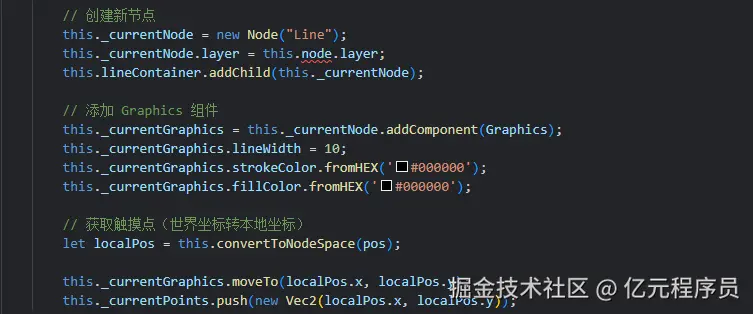 触摸开始时,创建新节点、添加Graphics组件、画线起点移动到触摸位置。