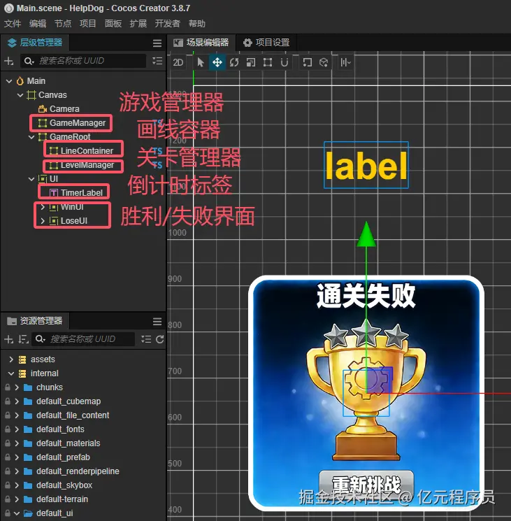 界面的拼接比较简单,从上到下分别是游戏管理器、画线容器、关卡管理器、倒计时标签、胜利/失败界面。