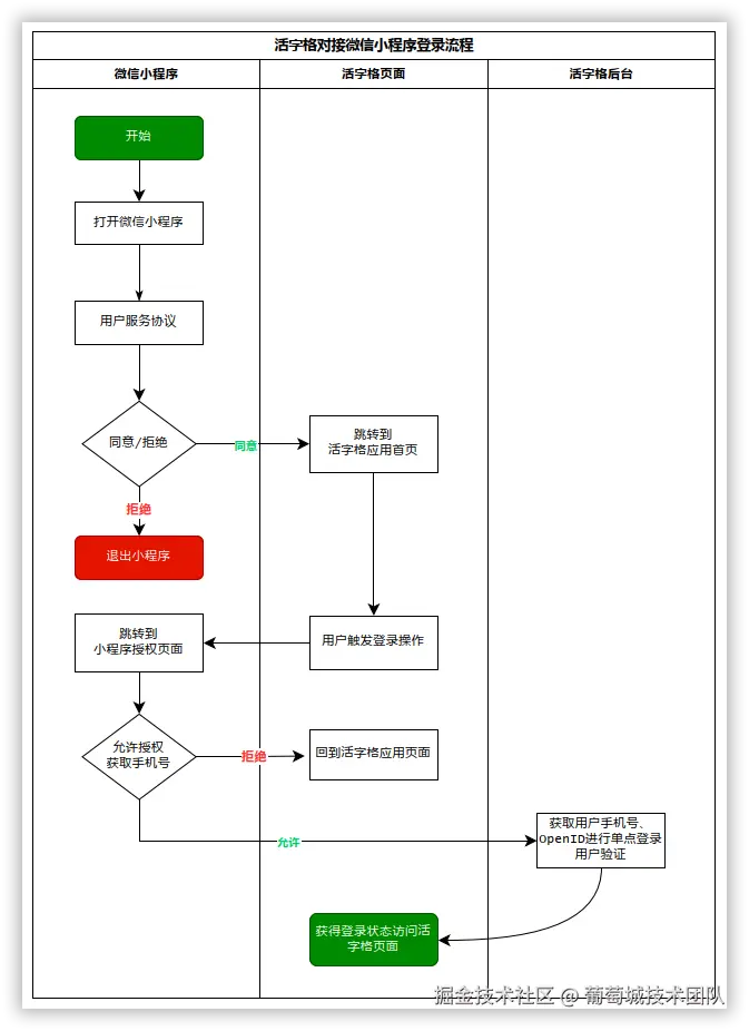 为了直观说明整个登录路程,以下是活字格对接微信小程序的登录流程: