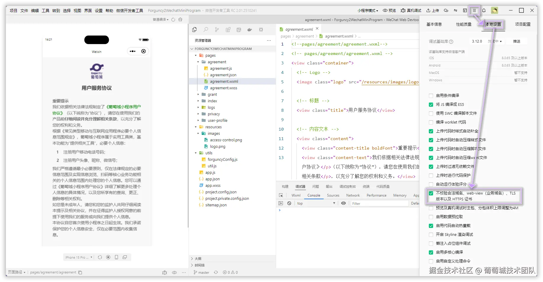 - 如果在微信开发者工具使用个人类型小程序开发,可以先勾选不校验合法、web-view(业务域名)、TLS版本以及HTTPS证书;