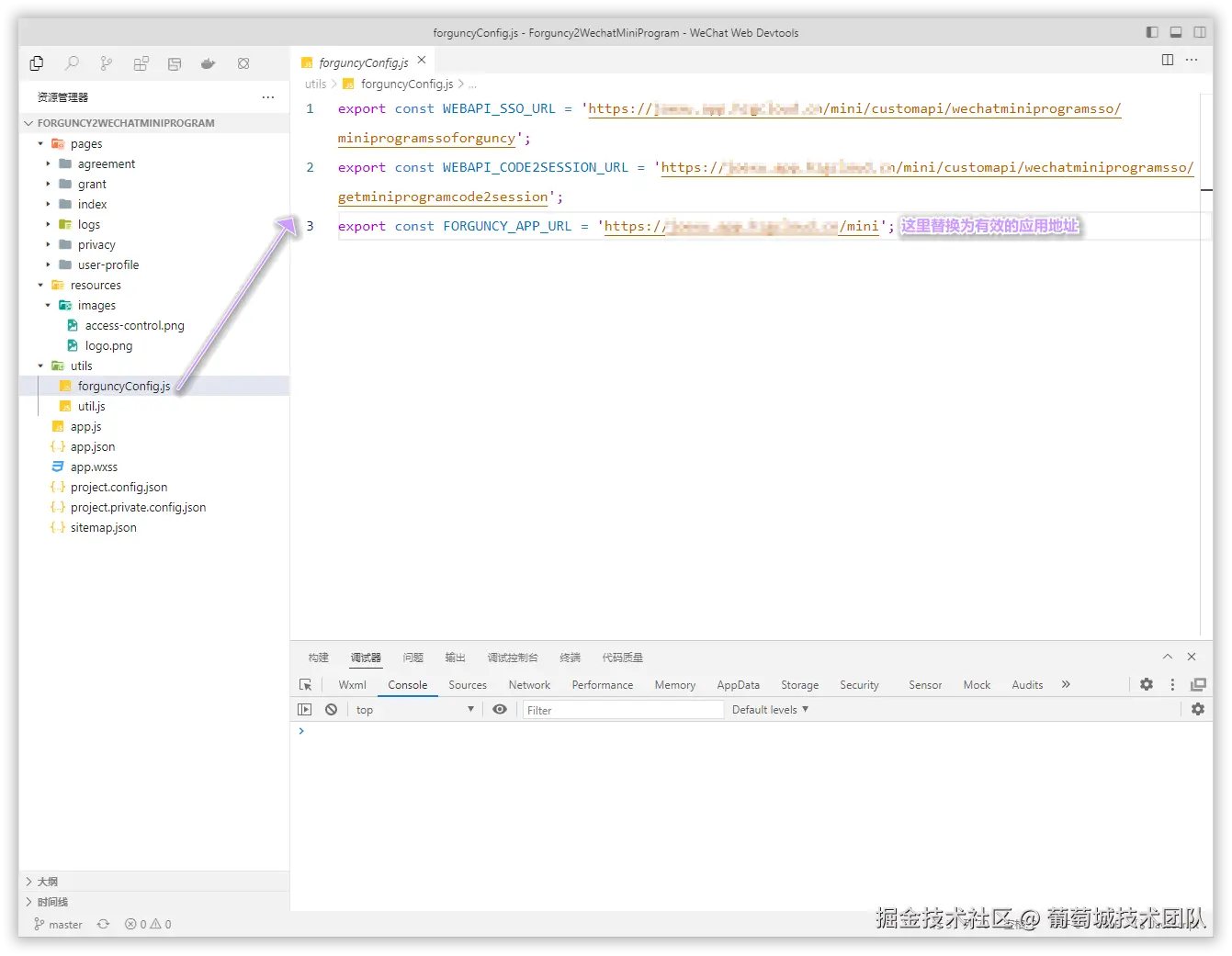 在这个微信小程序工程中,只需要关注一处,就是 forguncyConfig.js 文件,这里需要配置活字格应用地址,只需要在这里替换为自己的应用地址即可。