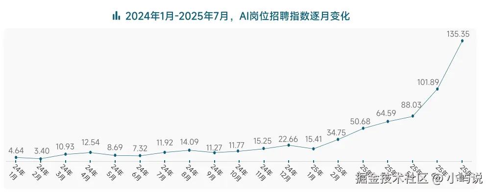 相当于每7个岗位中,就有1个迈入年薪百万行列。2025年1–7月,AI新发岗位数量同比增长10倍,上千家企业争夺超过7万个相关职位。
