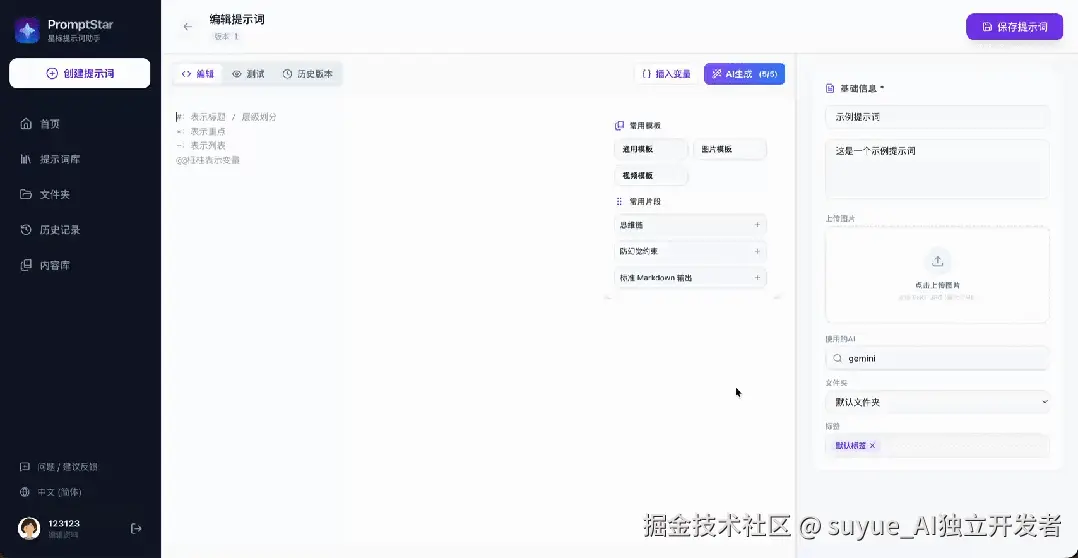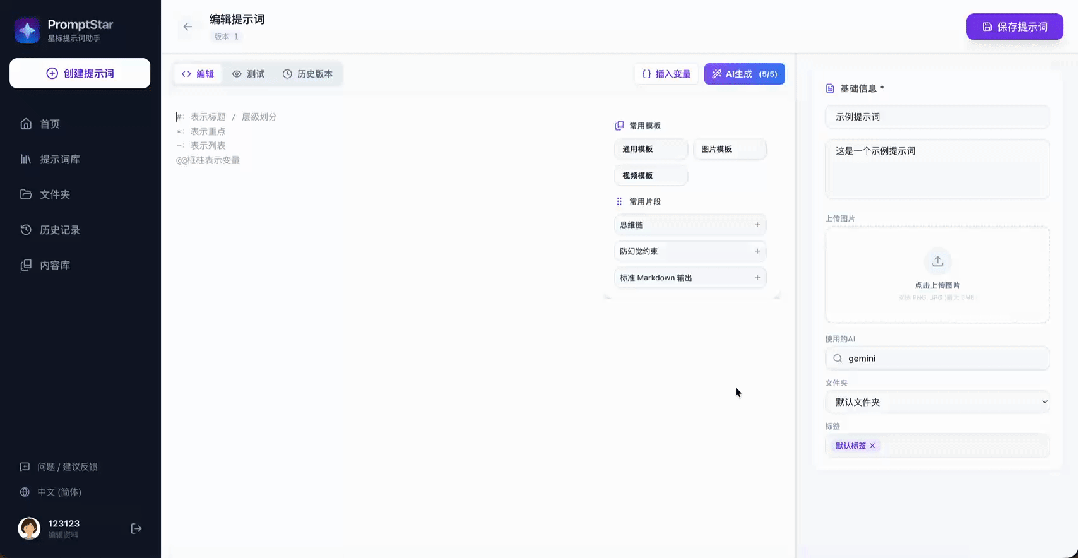(4)历史版本: 提示词是需要“调教”的。V1版效果不好,V2版逻辑不对等等,PromptStar内置了版本历史记录。你可以随时回溯到任何一个版本,对比效果。