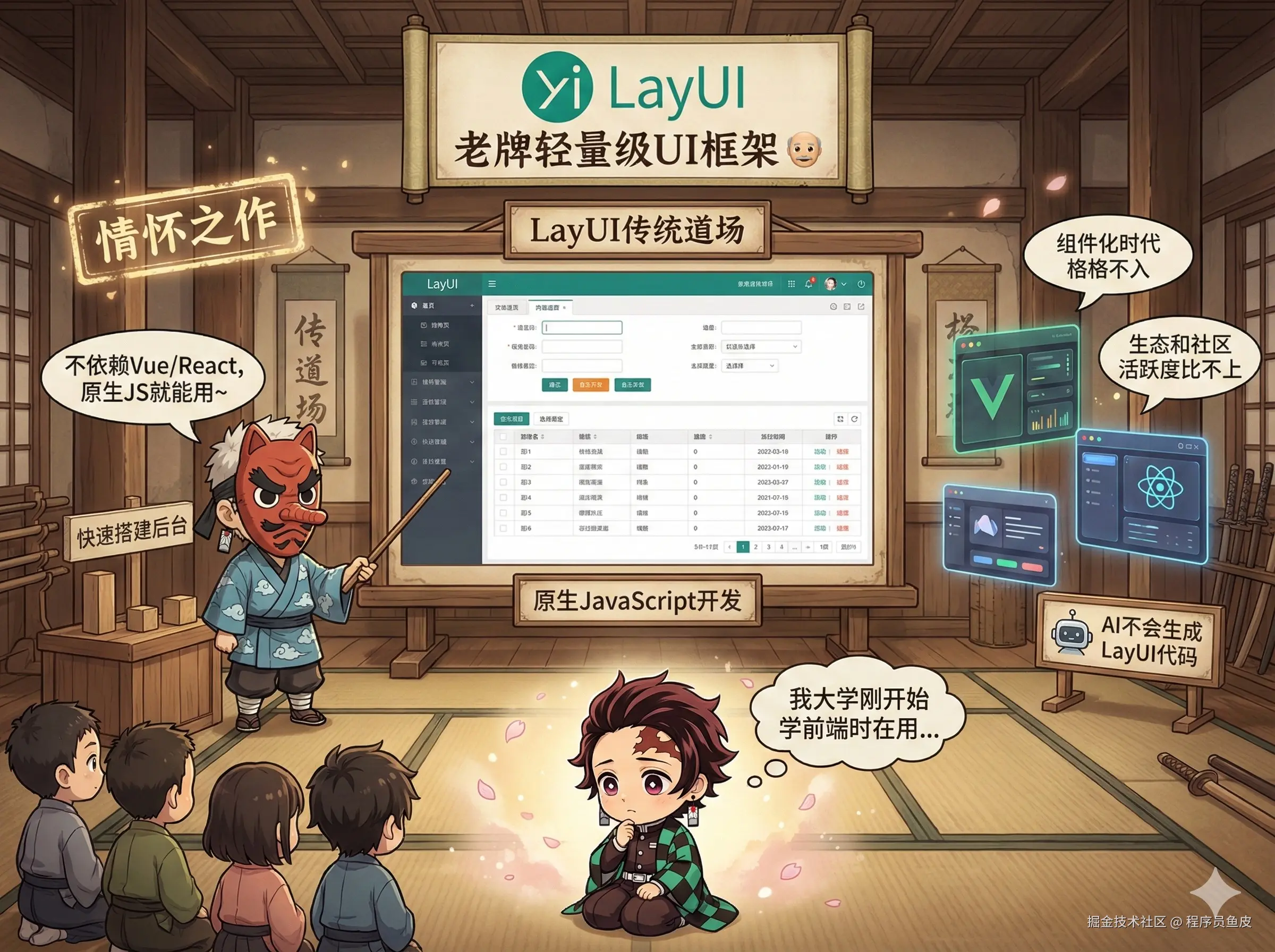 老牌轻量级 UI 框架,情怀之作。采用原生 JavaScript,不依赖 Vue/React。适合那些不想学现代前端框架、只想快速搭个后台的同学,我大学刚开始学前端的时候就在用。