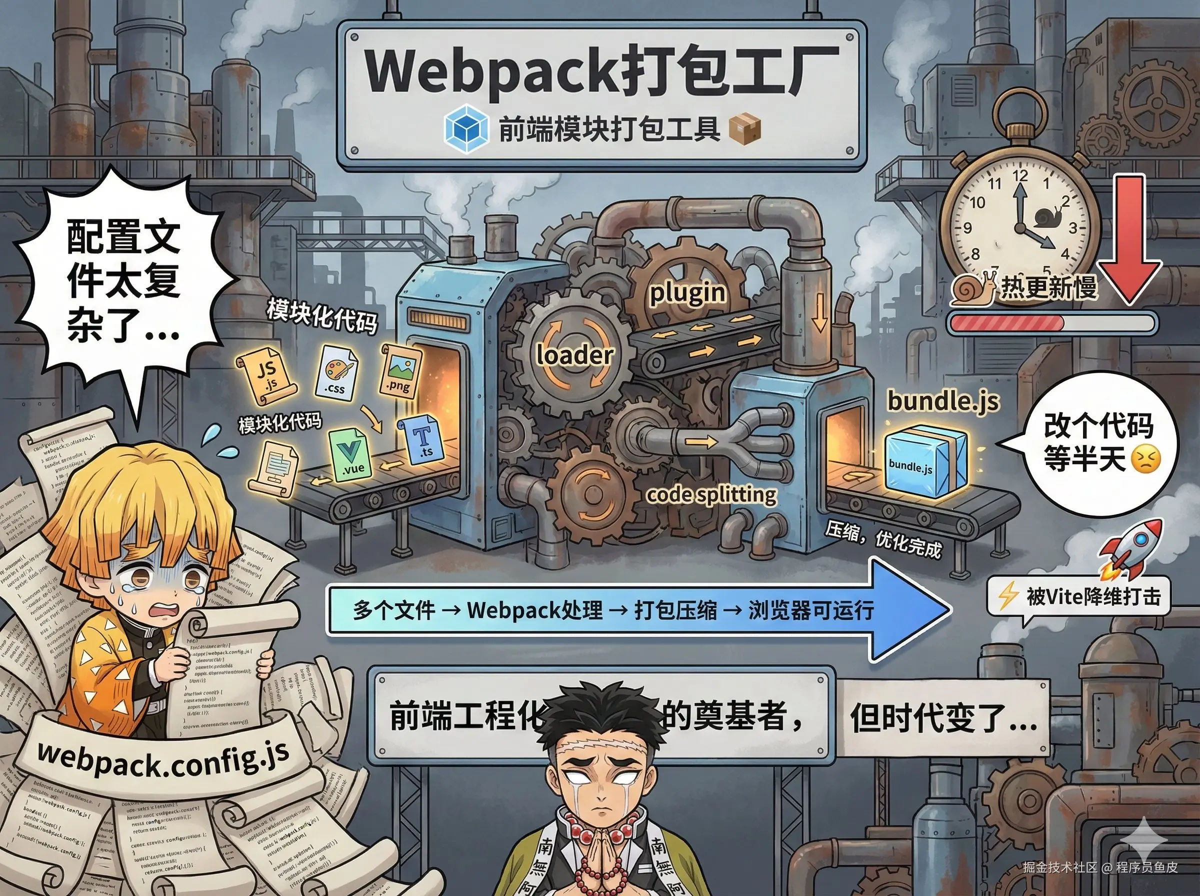 虽然它生态成熟、功能强大。但问题是配置文件动辄几百行,你如果学会了 Webpack 配置,就能去应聘配置工程师了。而且热更新慢到怀疑人生,改个代码等半天才生效。开发体验被 Vite 降维打击,正在逐渐被时代淘汰,只能给到 NPC。