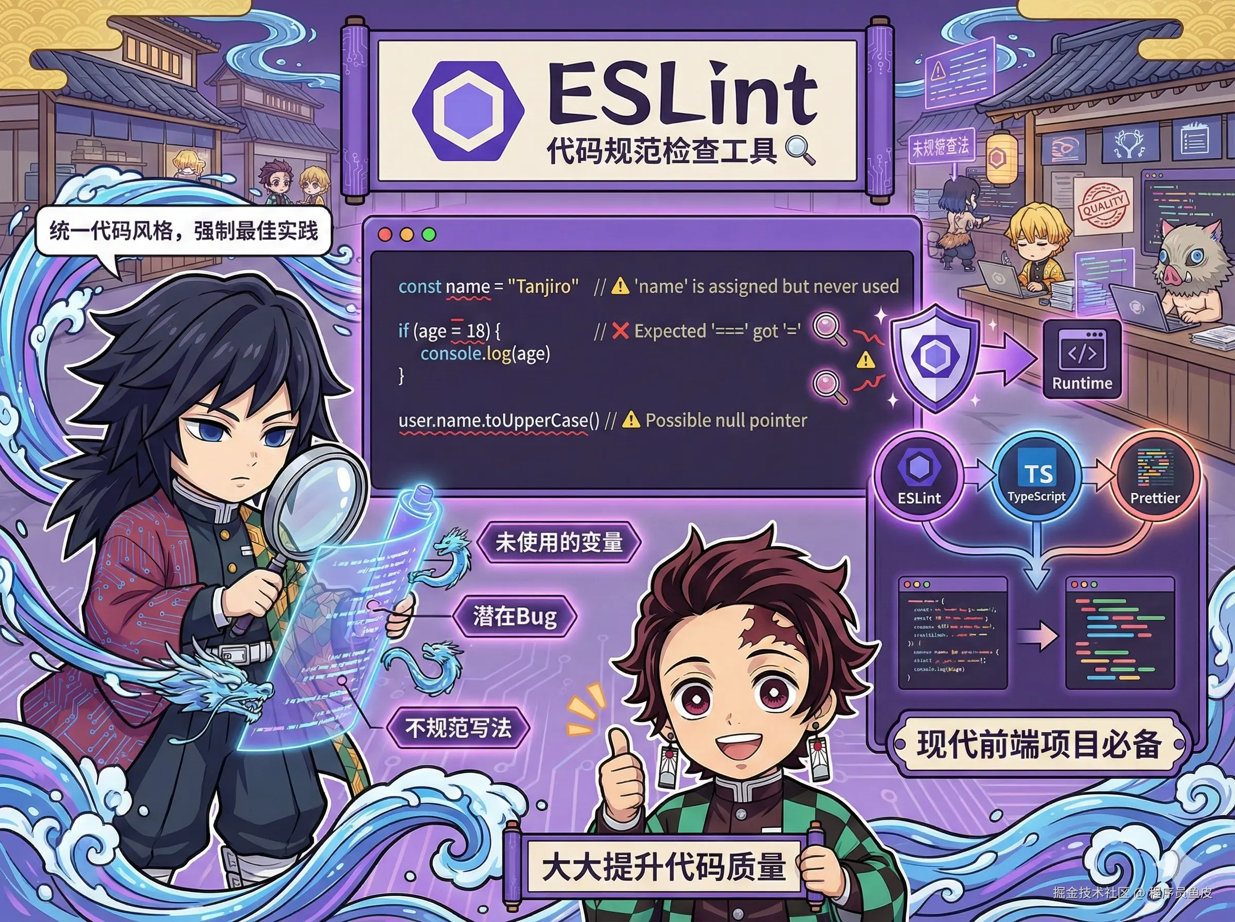 现代前端项目几乎都会配置 ESLint,配合 TypeScript 和 Prettier 使用,能大大提升代码质量,给到 顶级。