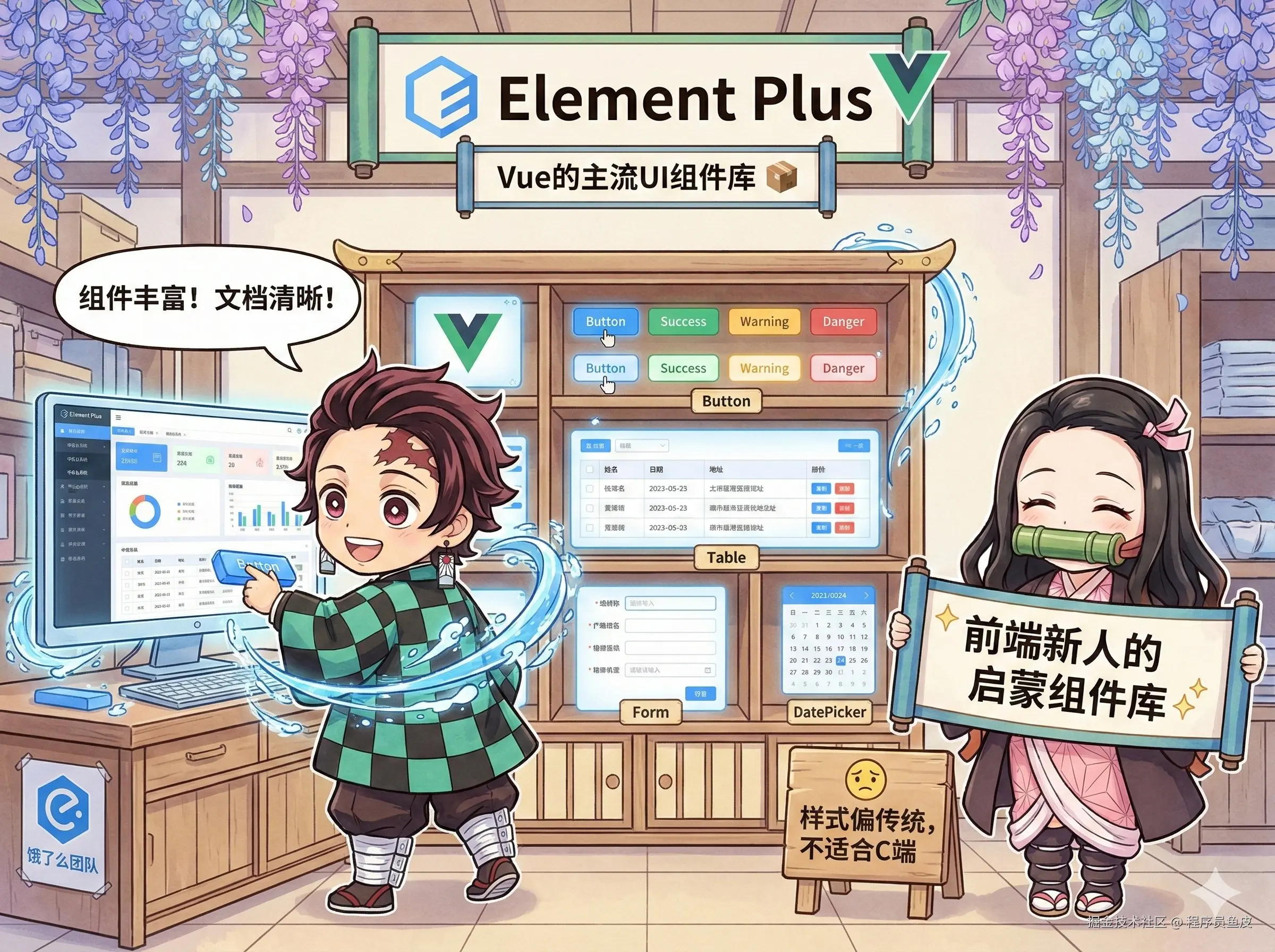 缺点是样式偏传统,不太适合 C 端项目,而且有些组件不够灵活。但考虑到国内 Vue 生态的主流地位,Element 是很多前端新人的启蒙组件库,给到 人上人。