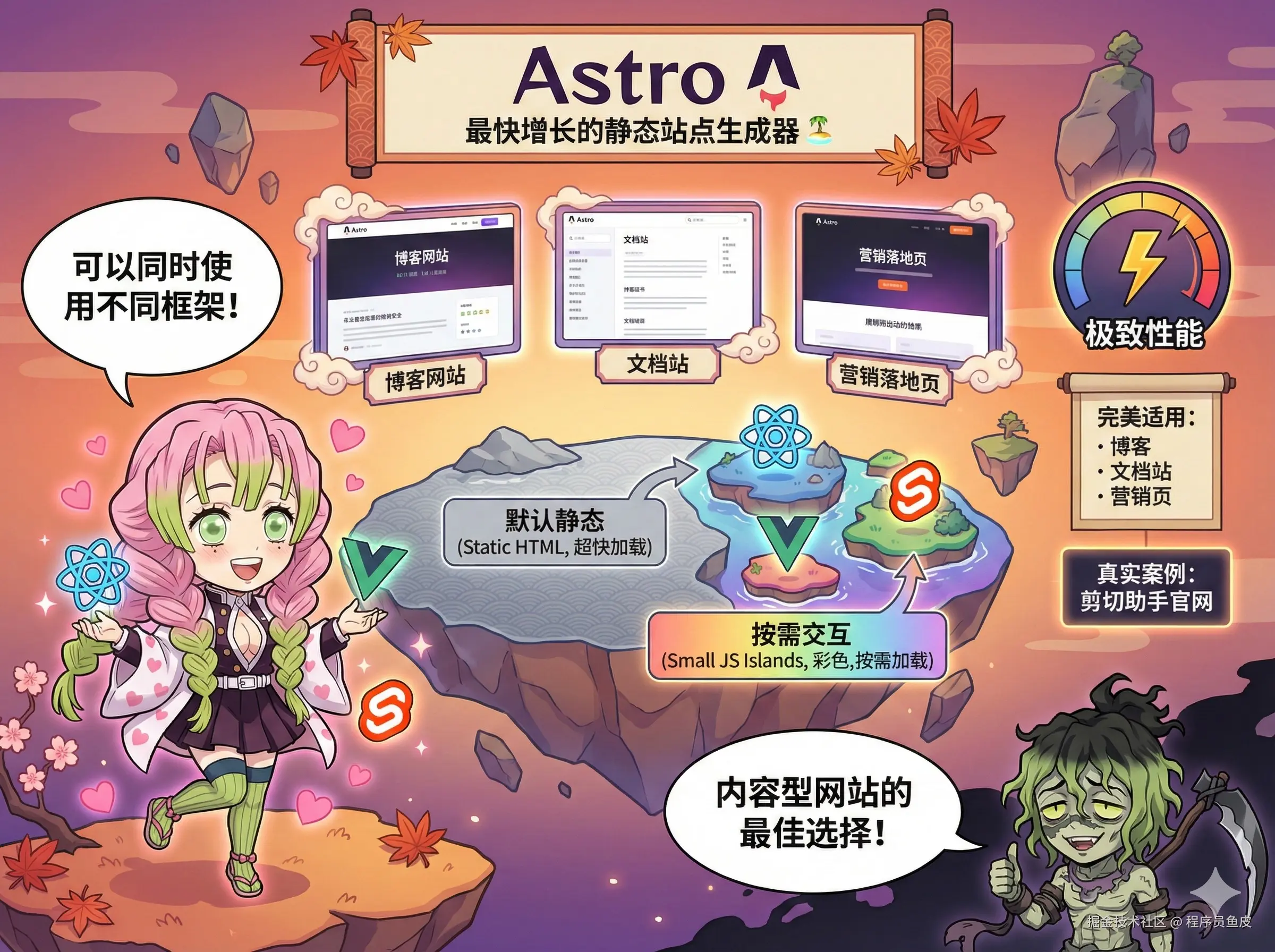 而且 Astro 很灵活,可以同时使用 React、Vue、Svelte 组件,不挑框架。如果你要做博客、文档站、营销页这些内容型网站,Astro 非常合适,像我们团队的剪切助手官网就是用 Astro 生成的。给到 顶级。
