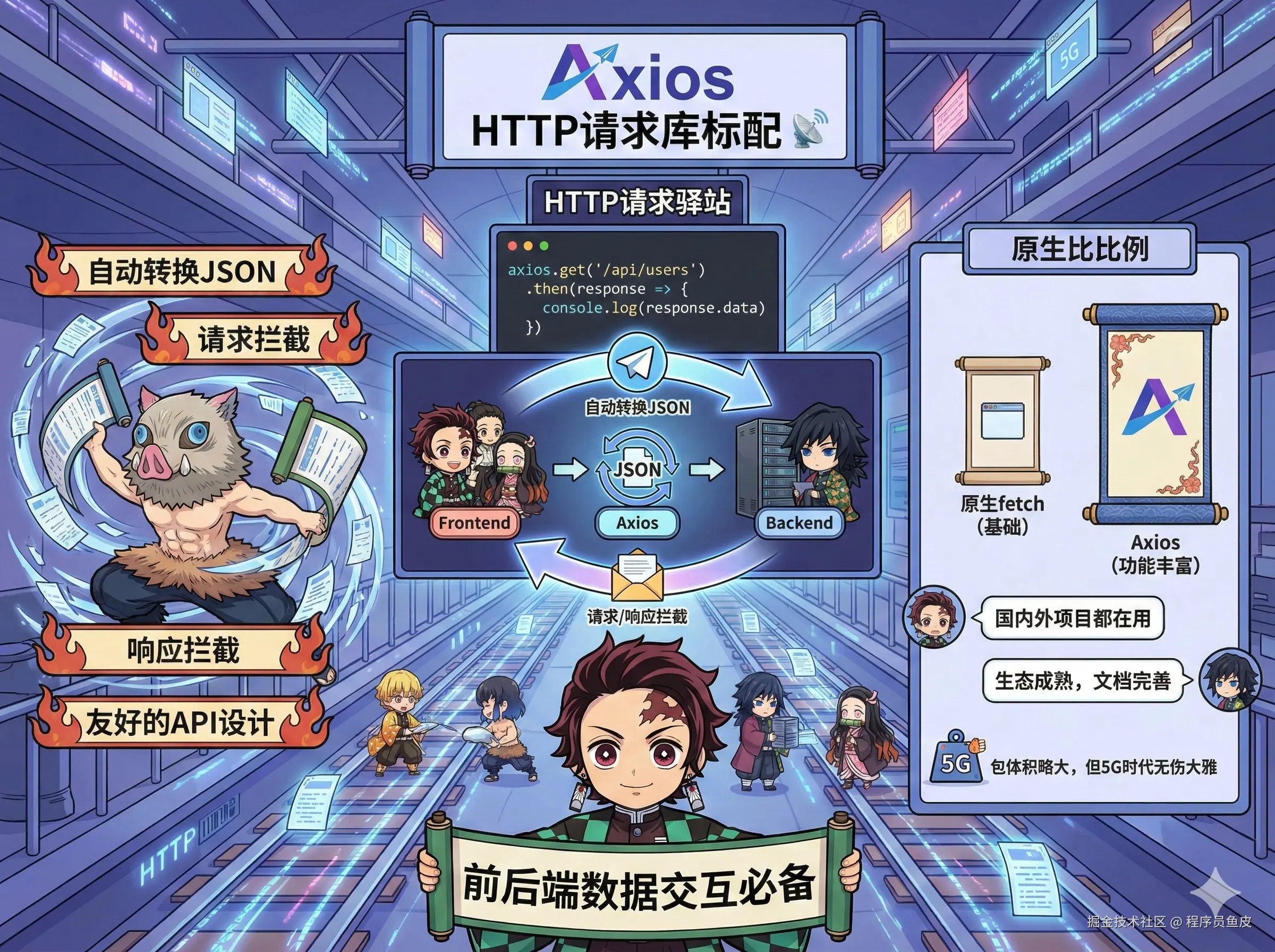 HTTP 请求库的标配,前后端数据交互必备工具。虽然浏览器有原生的 fetch,但 Axios 的 API 设计更友好,而且支持自动转换 JSON、请求拦截、响应拦截这些功能都帮你封装好了,用起来很方便。