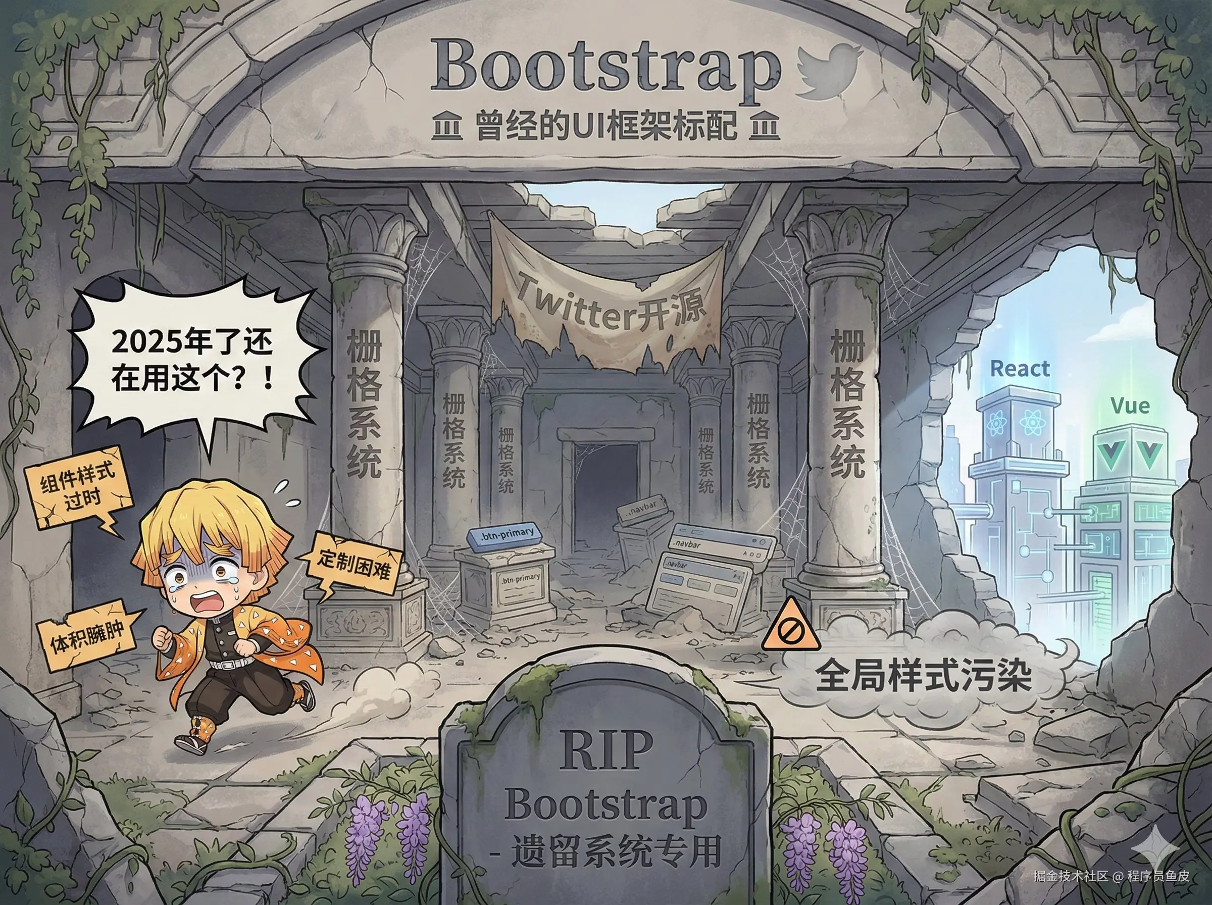但是 2025 年了,还在用 Bootstrap 的项目基本都是遗留系统。组件样式过时、定制困难、体积臃肿,React、Vue 当道,谁还用这种全局样式污染的方案?给到 拉。