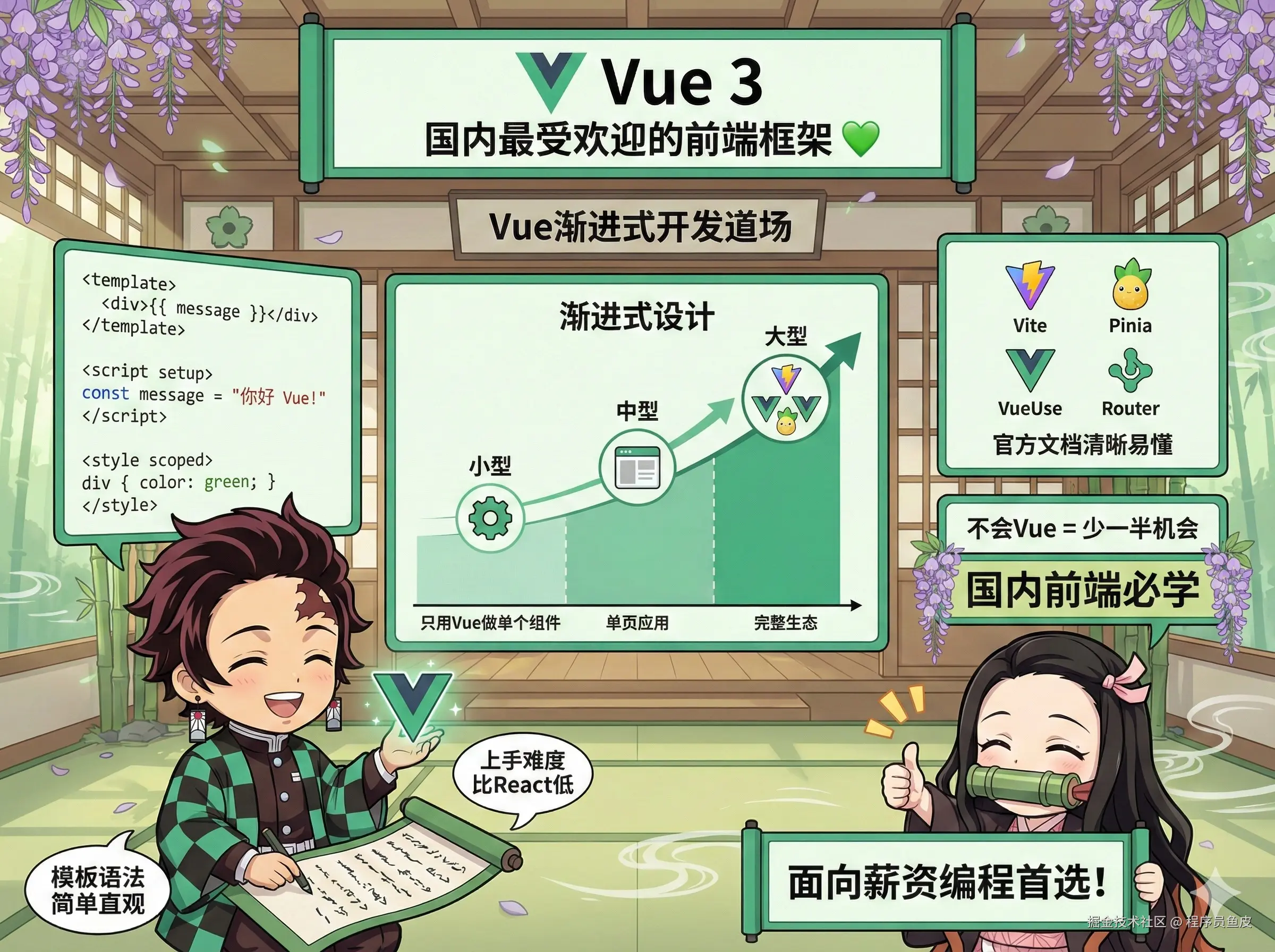 接下来终于到了大家期待的 Vue 了,国内最受欢迎的前端框架。它采用 渐进式设计,你可以只用它做页面的一小部分,也可以用它搭建完整的单页应用,非常灵活。它的单文件组件和模板语法简单直观;而且生态完善,像 Vite、Pinia、VueUse 这些配套工具支持都很好,官方文档写的也清晰易懂,上手难度比 React 低不少。