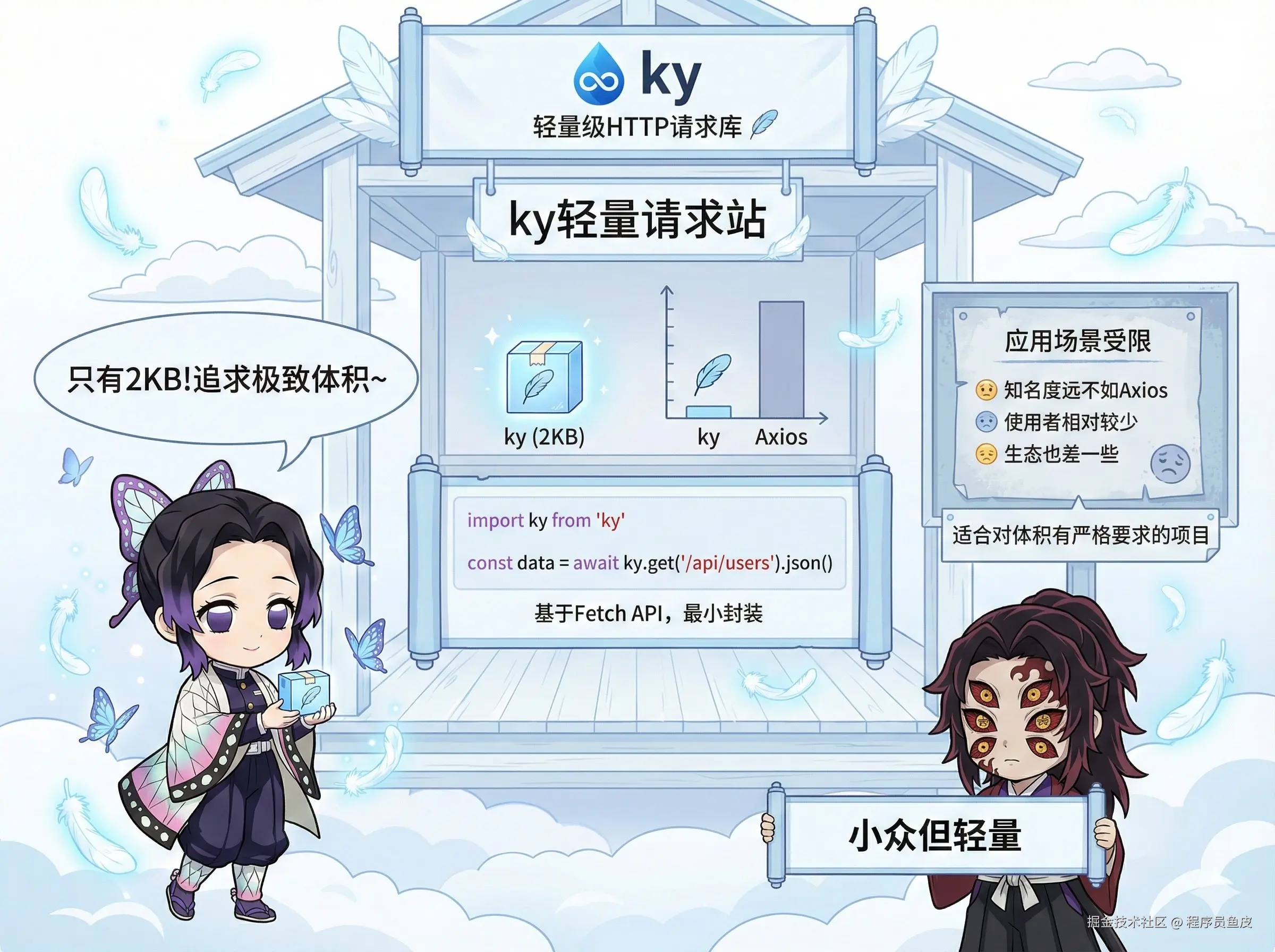 轻量级 HTTP 请求库(不是骂人的那个 ky)。基于 Fetch API 封装,体积只有 2KB!如果你追求极致的包体积,ky 是个不错的选择。