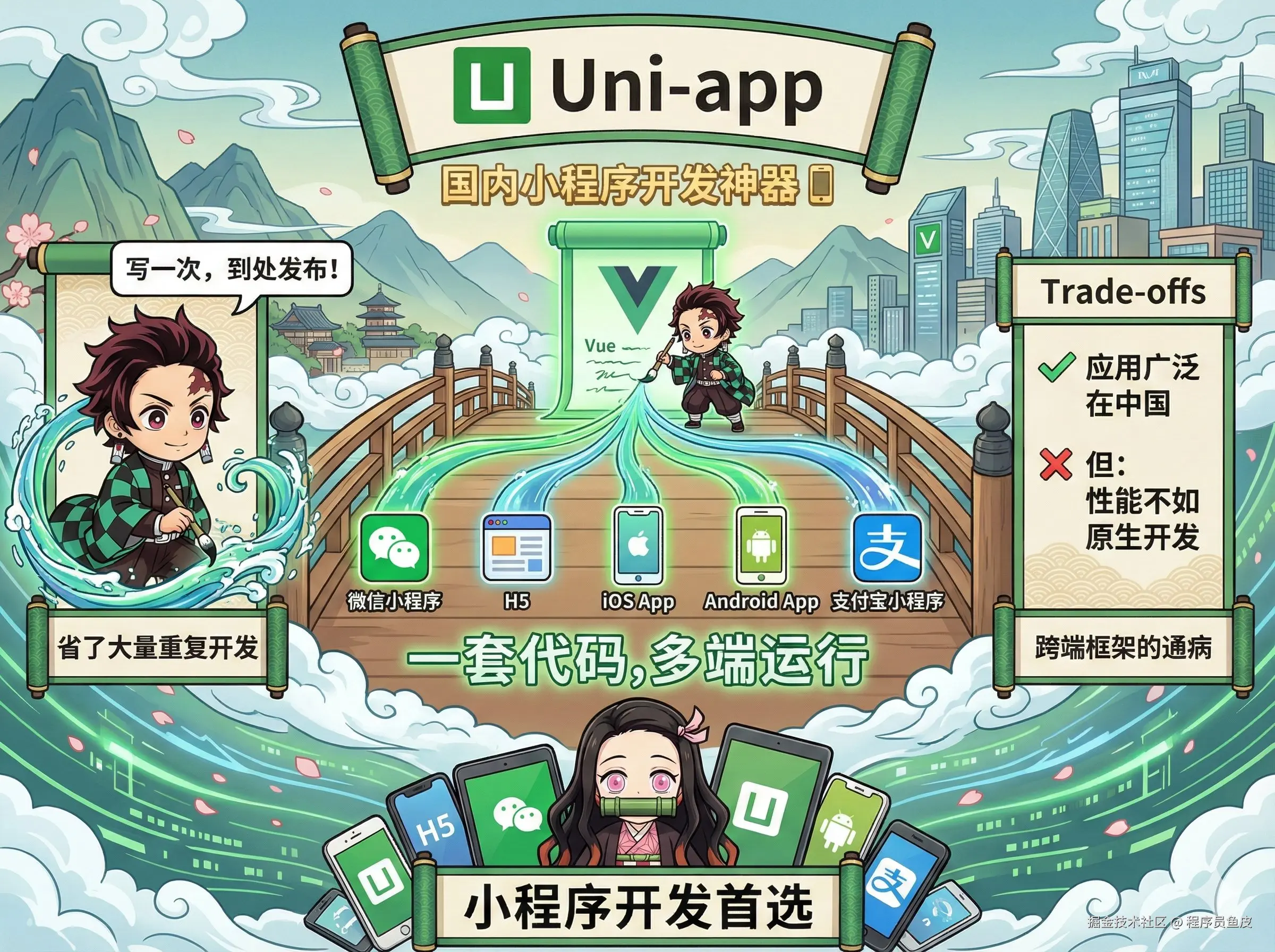基于 Vue 的跨端框架,国内小程序开发的神器。它最大的优势是一套代码可以发布到各个平台,像微信小程序、H5、App 全都支持,省了大量重复开发的工作。